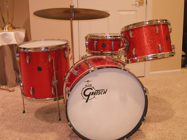 This is an original Gretsch Name Band drum set 20-13-16 with the matching Name Band snare in Tangerine Sparkle finish. It also came with a nice 20" Old K ride cymbal from the late 50's. The set was bought and owned by the original owner in San Diego, CA from 1966. It needs a litte work on the seams and the snare has 2 extra holes, but the finish is spectacular.