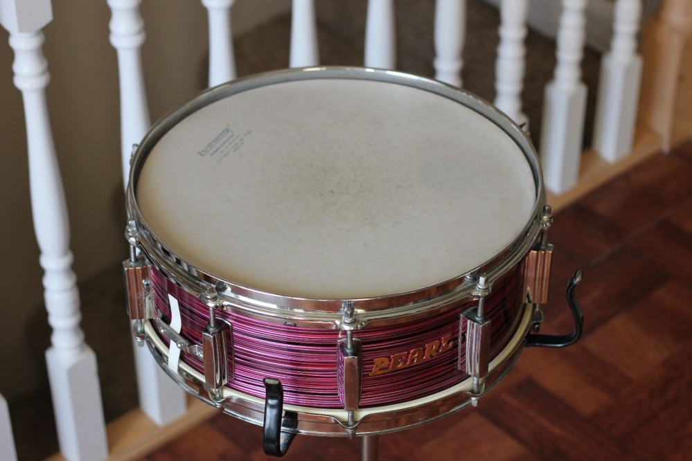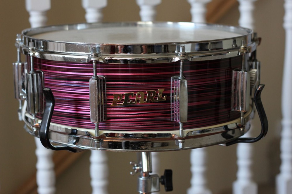 Over the decades, I've downloaded 1000's of drum pictures for personal reference. Most of these have come from eBay. Searching through all my MIJ drums, I found only one Purple Grain Pearl snare drum, which was "Pearl" manufactured. It was one of their higher end snare drums at the time...10 Battleship lugs and a nice strainer. The model number was 2414. The pictured snare drum sold back in April, 2014, for $230.50.