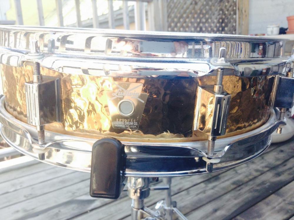I picked up this 13" x 3" Ludwig hammered bronze piccolo recently, but I got a little GAS happy and honestly didn't really need several snares that I bought. So I'm contemplating letting this one go. There are a few spots of oxidation on the shell, but since these are clear coated I can't do much to alleviate that. Beautiful crack and warm woody bronze tone. No weirdness, P-80 strainer works perfectly as do all lugs. I removed surface rust from rims, but there is a tiny bit of unchroming where some rust was. I'm looking for $300 plus actual shipping for Quebec City, Canada. If interested send me your zip code and I will get an estimate rapidly. These are fairly rare and Ludwig only makes a Black Beauty in these dimensions, which aren't cheap.