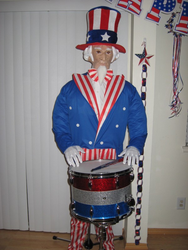 My girlfriend loves all the special holidays! Here's her latest creation...Uncle Sam, which she made, in front of a custom made marching drum I put together. Very patriotic! The drum was constructed from a late 70's Tama Imperialstar 14x10 rack tom with 9-ply shell, reinforcement hoops and Zolacote interior coating. Sam Barnard, of www.jamminsam.com, made the custom Red/Silver/Blue sparkle wrap for me. Sam had to do it three times to get it right. Thanks Sam! Snare beds were cut and I was able to find these die-cast Gretsch-style lugs that fit the existing lug holes. The drum looks and sounds great! I'll be using it this 4th of July for our annual backyard concert! Hope you all enjoy my girlfriend's creation and have a Happy 4th of July!!