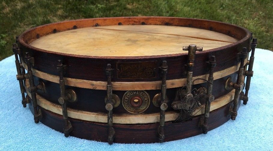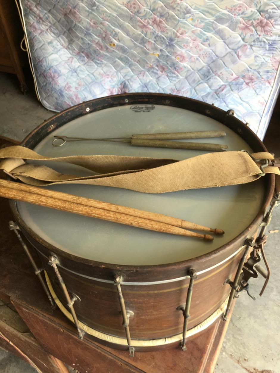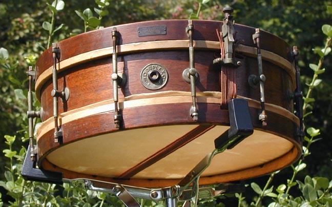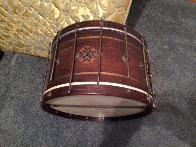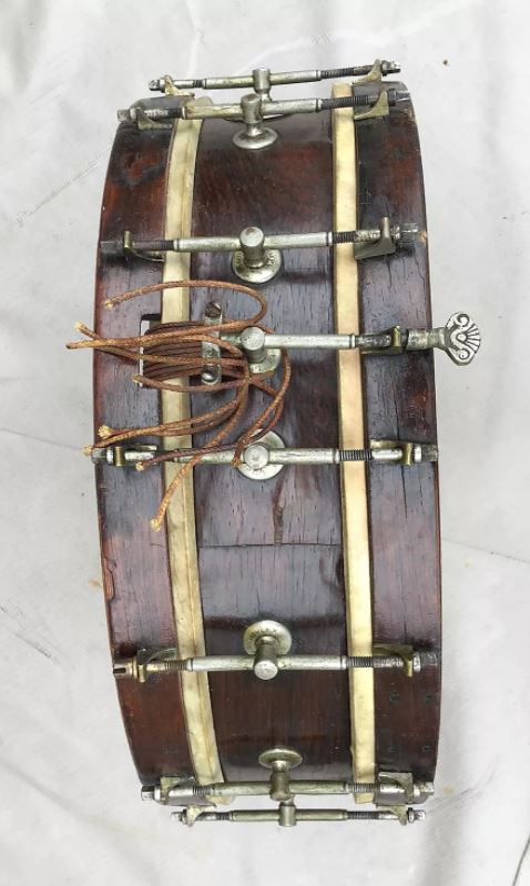 To me the most interesting feature is the use of L-angle pieces mounted directly to the wood hoops for tensioning the heads. The tube rods offer single tension, which was also not particularly common in early marching drums. There are also many more than the typical eight tension rods per side. I keep counting 15, but hope that I am just not seeing the 16th.