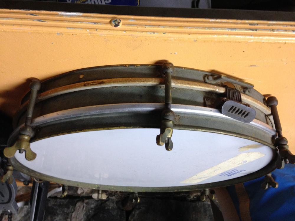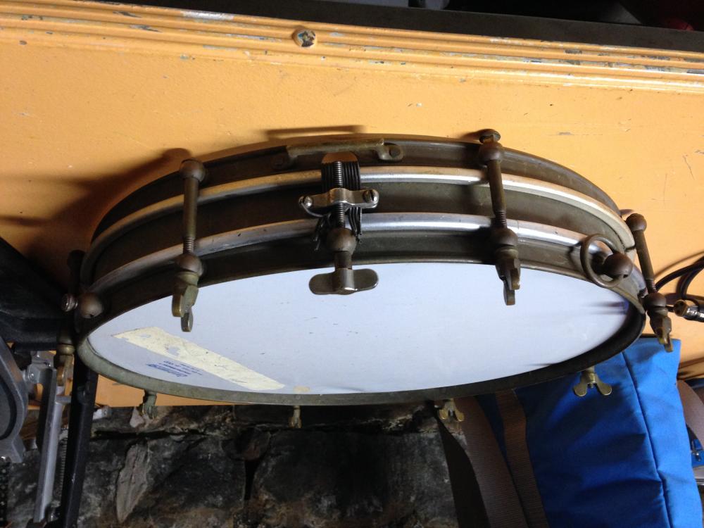 That's tough given the age on that bad boy. First I would take it apart and look for any engraving on the shell. It looks to be a metal shell ( correct me if I'm wrong ) And I know the bigger companies of the time did usually engrave their name. I'll take a look through some catalogs, but those early 1900's drums can be tricky to trace. Though what really has me perplexed is both the strainer and the fact that the lugs appear to be mounted directly to the drum rims. I can't recall having seen that before.