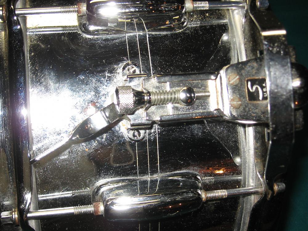 cmartin hit the nail on the head. Definitely a Super Sound King. Same chrome-over-brass shell as the Gene Krupa Sound King, but with an extended parallel snare mechanism akin to Ludwig's Super Sensitive.