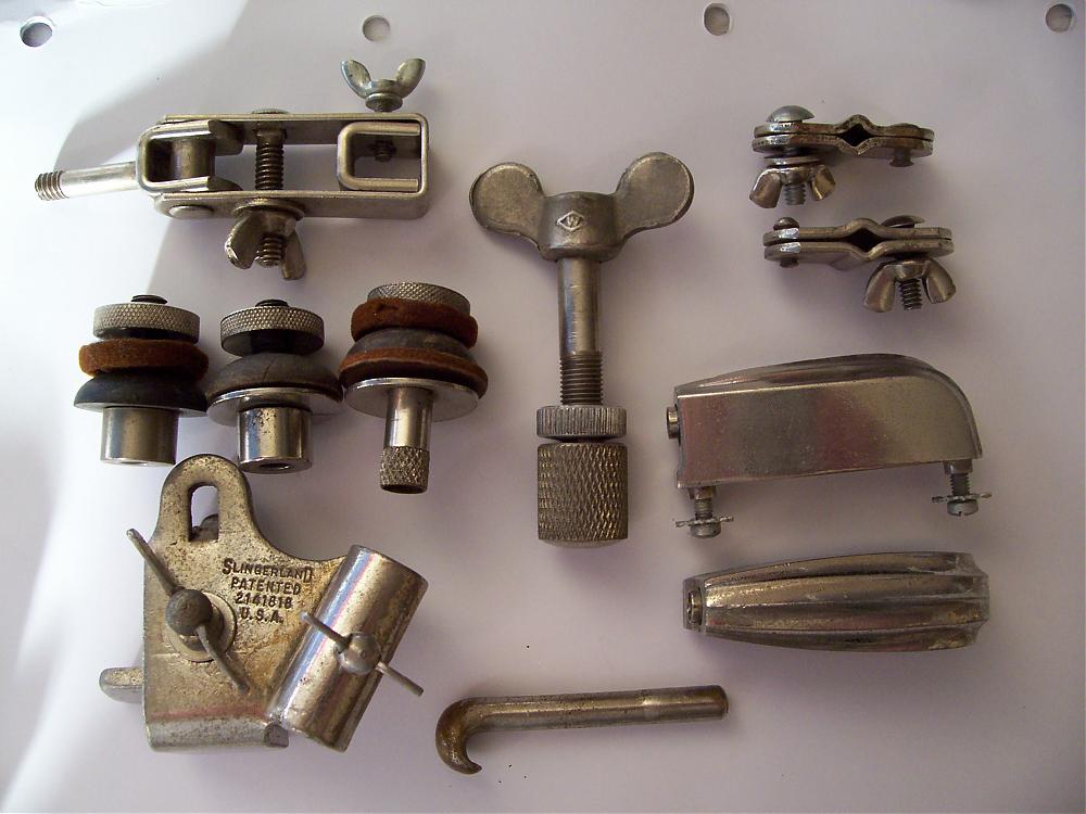 Hey Surface-What you have is-on the top is a W&A cymbal tilter.the three other things under that are Duplex or W&A cymbal holders..in the middle is a W&A hi-hat clutch and to the right the two things are parts that mount under the clutch on the h-h rod..the other parts are slingerland radio king lugs,spur mount,claw...The W&A parts are from the 30s-40s..slingerland parts are from the 40s...Mikey