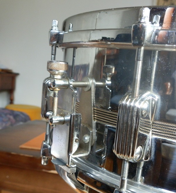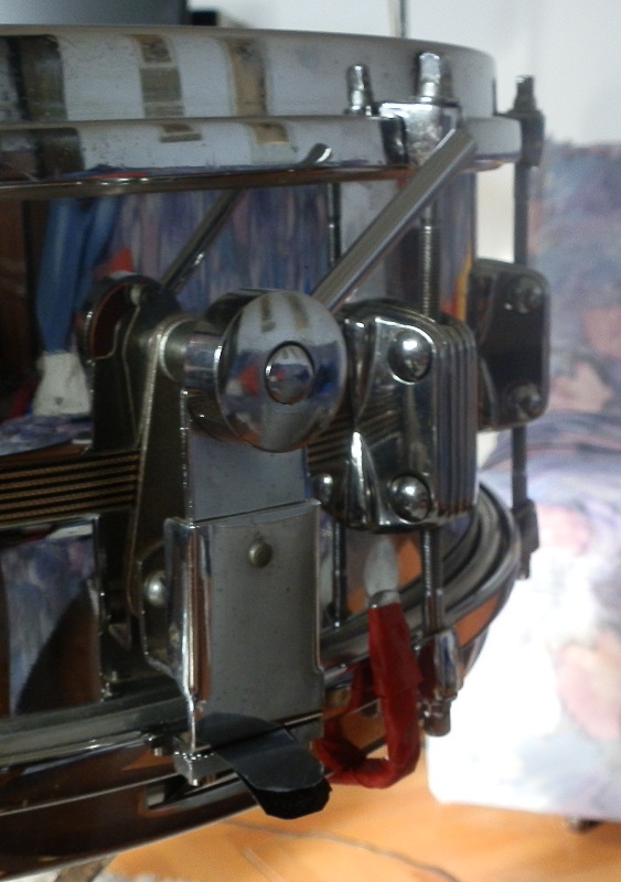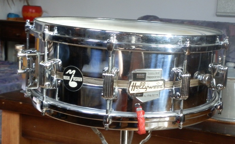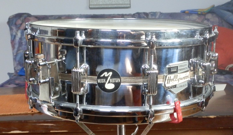 Another Italian snare drum in my collection.It is 14x5,5,COS,with ten lugs.Have black yellow strip in middle of shell.It is same as on picture here in VDGuide in Hollywood section,but don't have hexa tension rods,but square.It is heavy snare drum,with welded seam .It has unusual curved bearing edges,called it that way,not sure,but I think it has metal ring around which is bearing edge made.I try to take pic,but don't think you can see it