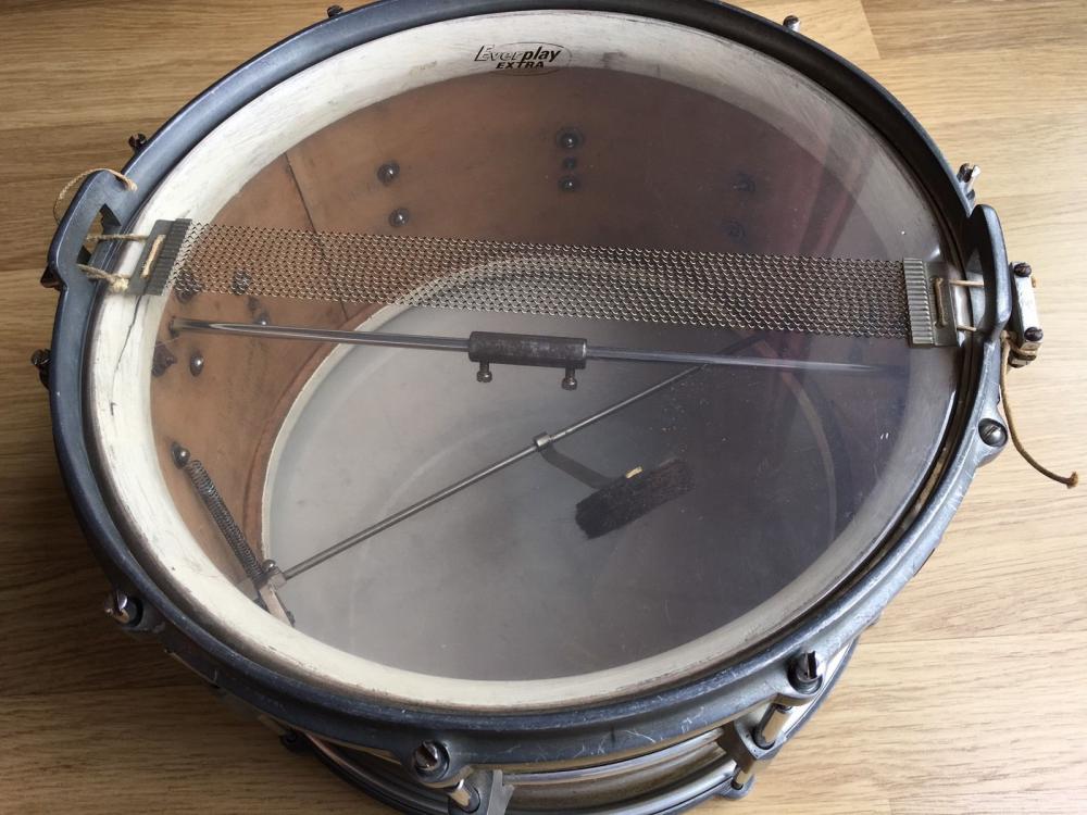 Thanks for the input RALF.. GREEN GLASS ..AND KEVINS. Ive actually just bought the drum from this guy. These are the pics from the advert so once i get it i will show more detail with a full strip down. If you look inside on pic 1 to the left there is some writing. I cant make it out. Also butt and strainer how cool do they look. They look solid and i must admit never seen em in my life time. The lugs ive seen but just cant place them. Tension rods to me look british. The damper so cool what is that about sort of swings into position. The re rings are wood and painted white with a split in one which is an easy fix. One last point the beading on the outside round the middle making the drum look fab. I bought the drum because its so cool and unusual. The hoops are 10 hole solid cast. I think it could be a proto type that just costed too much to produce. The build looks classy of the 30's or maybe 40's. Im sure someone will chime in with the details....Thx...sean.