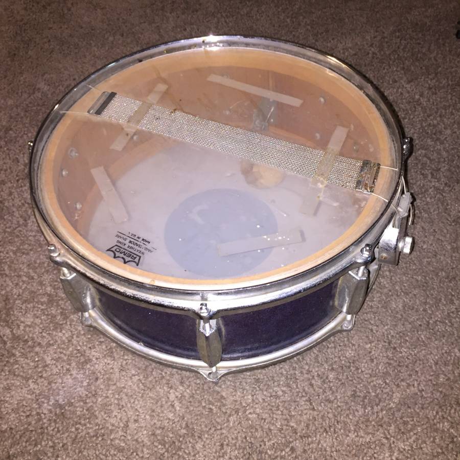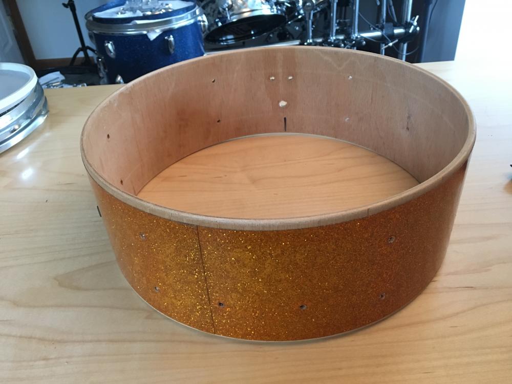 It originally had the orange sparkle wrap on it which I show in one of the pictures, but it was bubbling pretty badly and I think it was causing fitment issues with the heads. I took the wrap off then sanded and stained the shell. The bearing edges were almost non-existent; they were pretty much flat with no snare bed either, so I shaped the snare bed and cut the bearing edges.