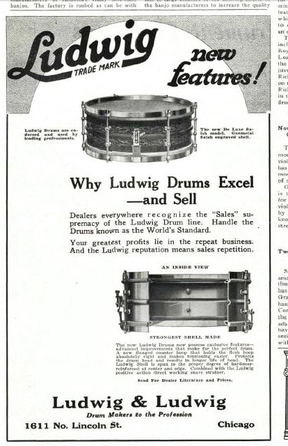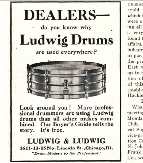 The image included below is a Ludwig ad from 1922. I've titled it: December 2, 1922 Ludwig Ad Pg 34 In Music Trade Review Mag