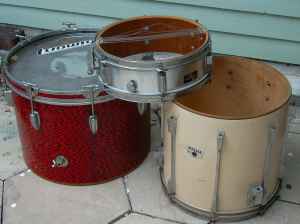 Need some help identifying the bass drum in this photo...has a ludwig head, but not sure about the fact that it seems to be a "one head" drum...there are no lugs or hoop on one side and it doesn't look like there are any holes for missing lugs...Is this in fact a Ludwig, and what else can you tell me about it...age, etc.