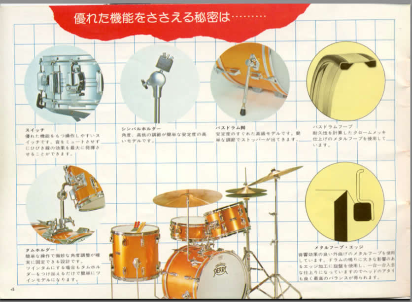 Here`s some detail from the 1975 President catalog section. Notice the big, heavy duty Rogers copy lugs in the catalog page kit- that happened in 74/75 . Great lugs big, heavy duty rectangles.