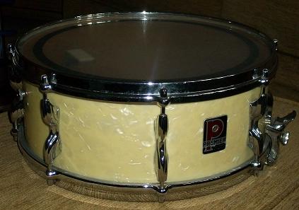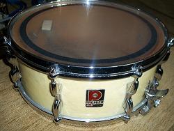 It is a Premier, I think the snare may be approx. 1963 - Premier Royal Ace Snare Drum with Floating Strainer (double 10). It is 5 1/2 x 14". There are 8 lugs. The bottom drumhead is an everplay.