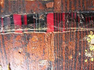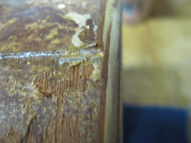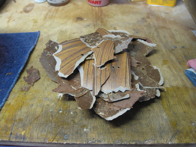 I could only see what looks like Mahogany that goes into the shell. The wrap I removed looks like some type of wood grain formica covering. It is extremely stiff and was very difficult to remove. Lots of damage to the shells outer layer.