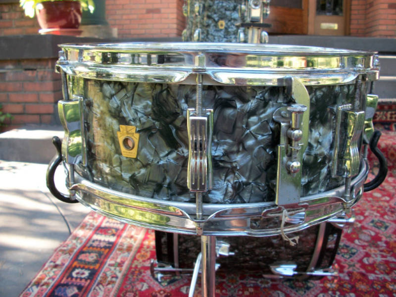 In the last pic, if you very carefully on the left side of said minty fresh snare, you can JUST make out a.....PEARL, very mid-70s Pearl muffler knob.