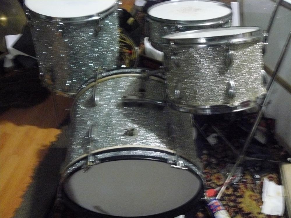 Hand Glittered Over old wrap ( still re-wrap able). Lost interest 300 plus shipping included L arm, spurs all lugs. t-rods etc lugs are almost exact Gretsch copies. Shells are pretty decent gray interiors