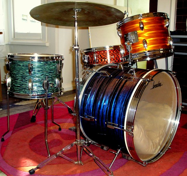 This one is for my sister in-law's Friday bar she runs in her house for friends. The snare is a Star badged Swingstar, the rack tom is an early 70s Yamaha 13", the floor tom is an old Drouyn (Australian) 13" tom converted (don't worry, the drum had been drilled for the Ludwig lugs and an MIJ mount etc when I aquired it so drilling for the leg brackets didn't seem like too bad an idea). The bass drum is unknown. It had once had centre lugs but has had these ones installed at some point.