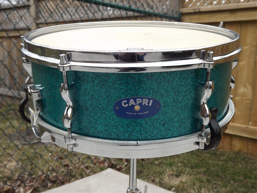 Here is a vintage John Grey Capri snare...It has 6 lugs...Size is 5" x 14"...All original except top batter head and snare cords...The wrap is in near mint condition and the chrome has very minimal pitting...