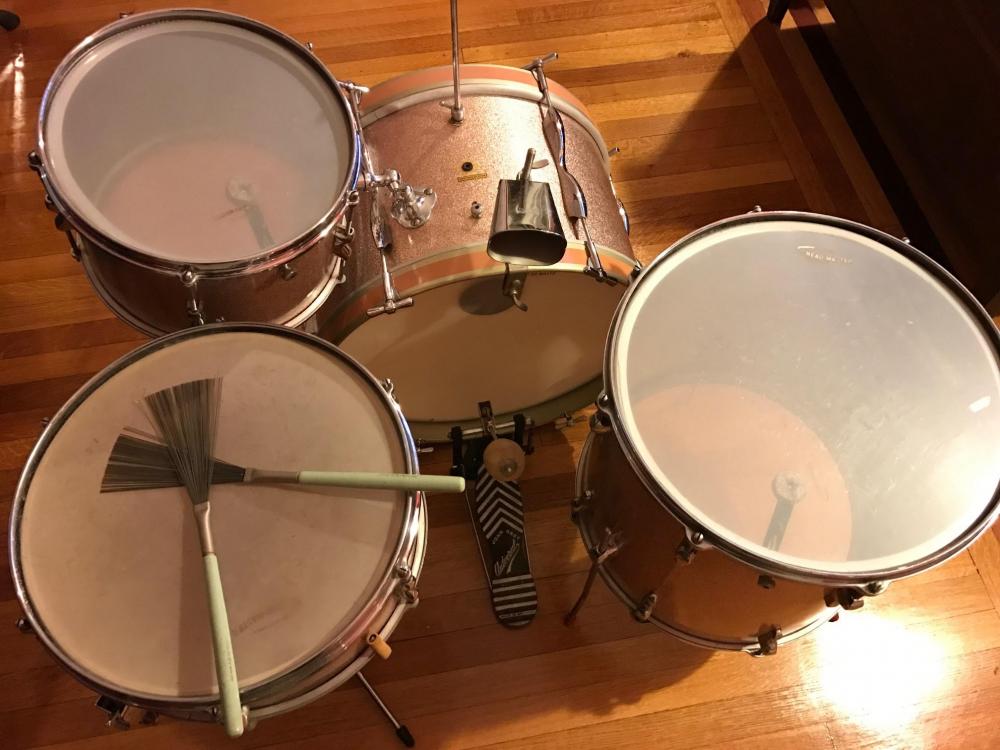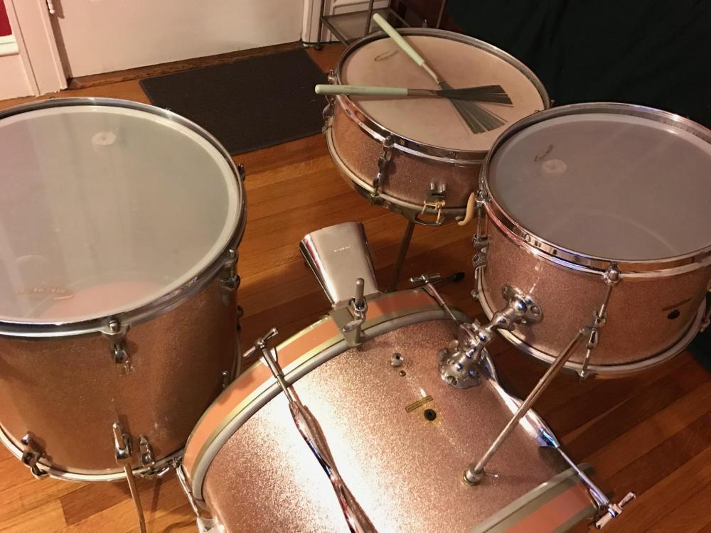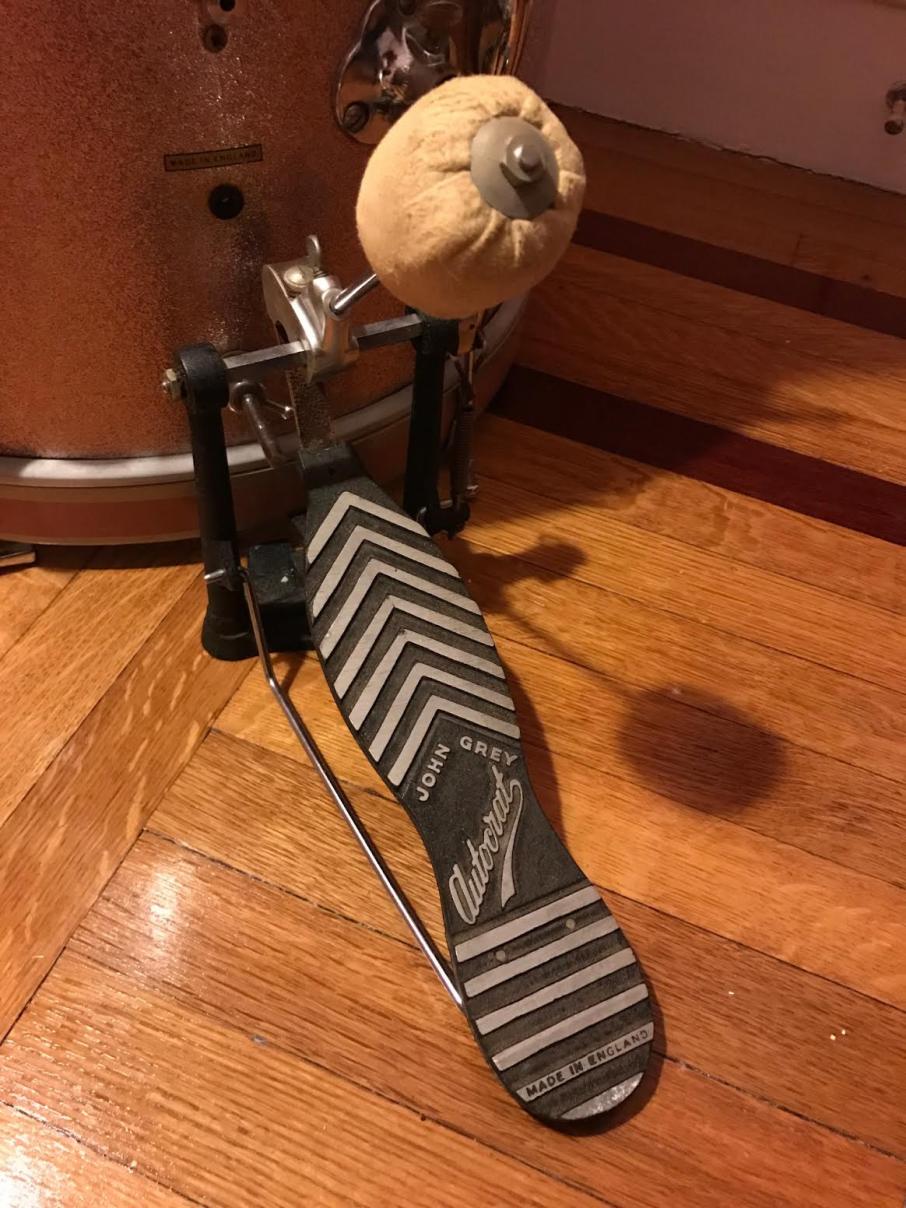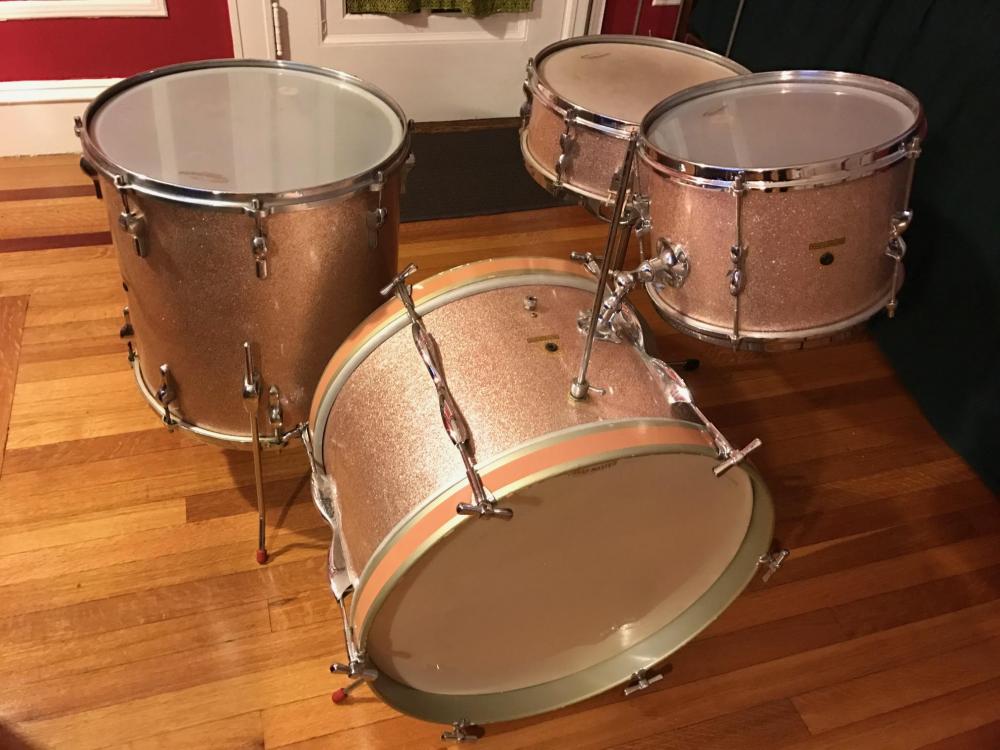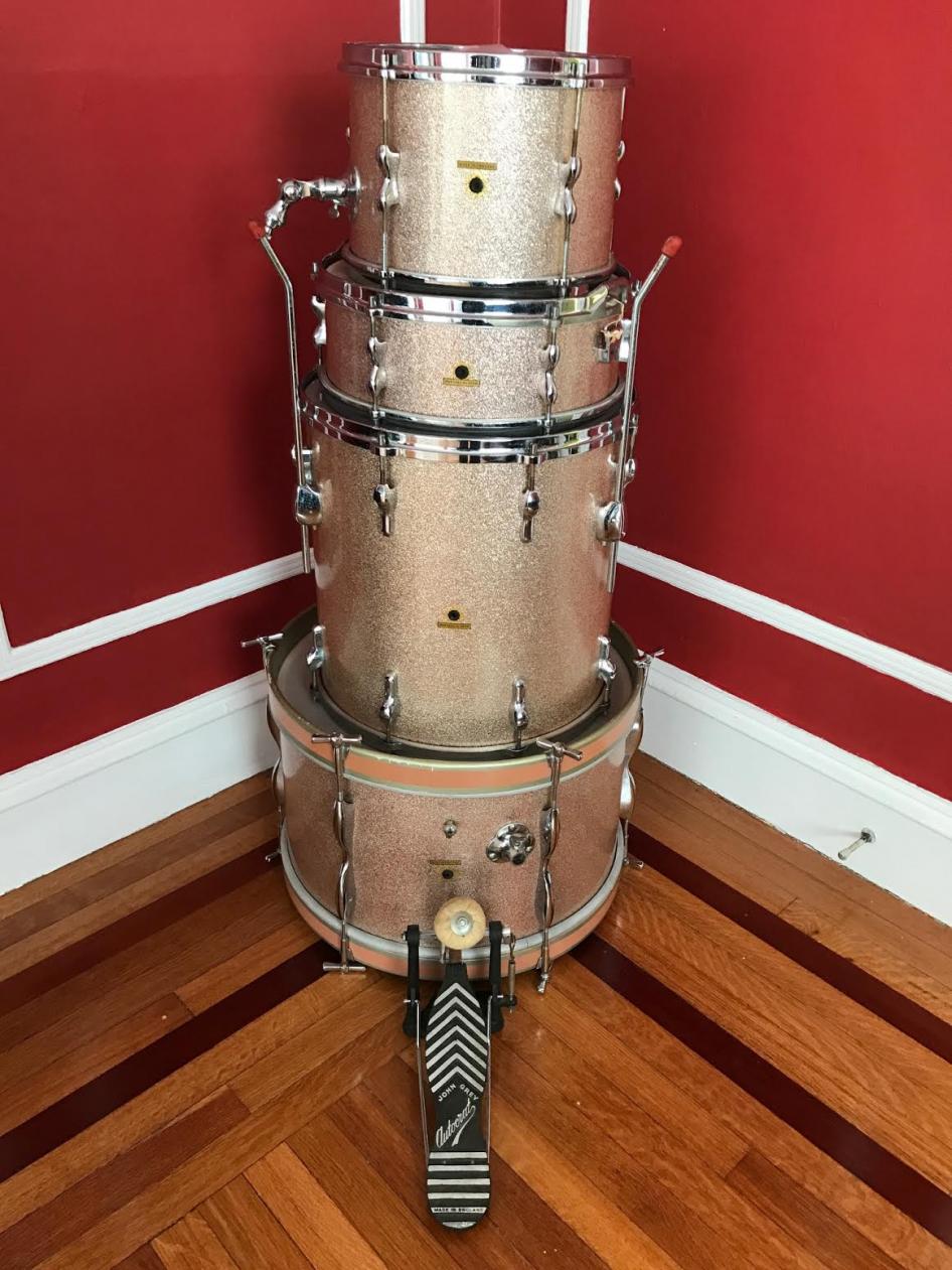 Just curious if anyone knows anything solid about this kit. Ive never seen one in person before. It appears to be 100% original and barely played. Missing the tilter on the shell mounted cymbal holder, but otherwise...man. Its cool! Sizes are 12x20, 8x12, 16x16, 5x14 and they appear to be all international sizes. Has the original cow bell holder (and the bell is Beverley) and sticks/brushes.