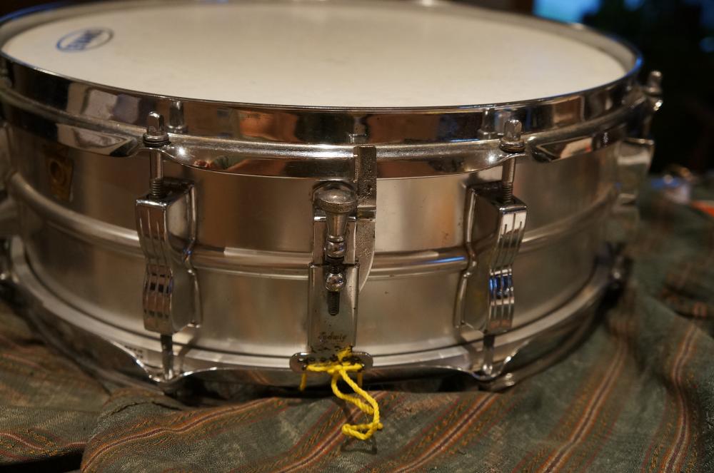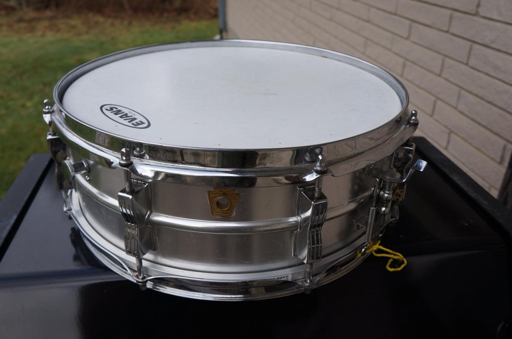 Ludwig script on butt and throw-off. Black felt muffler works perfecly - Very clean drum. Ready to play.