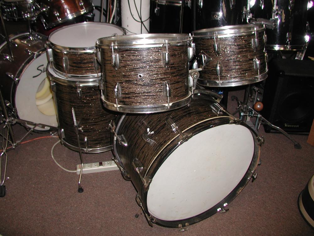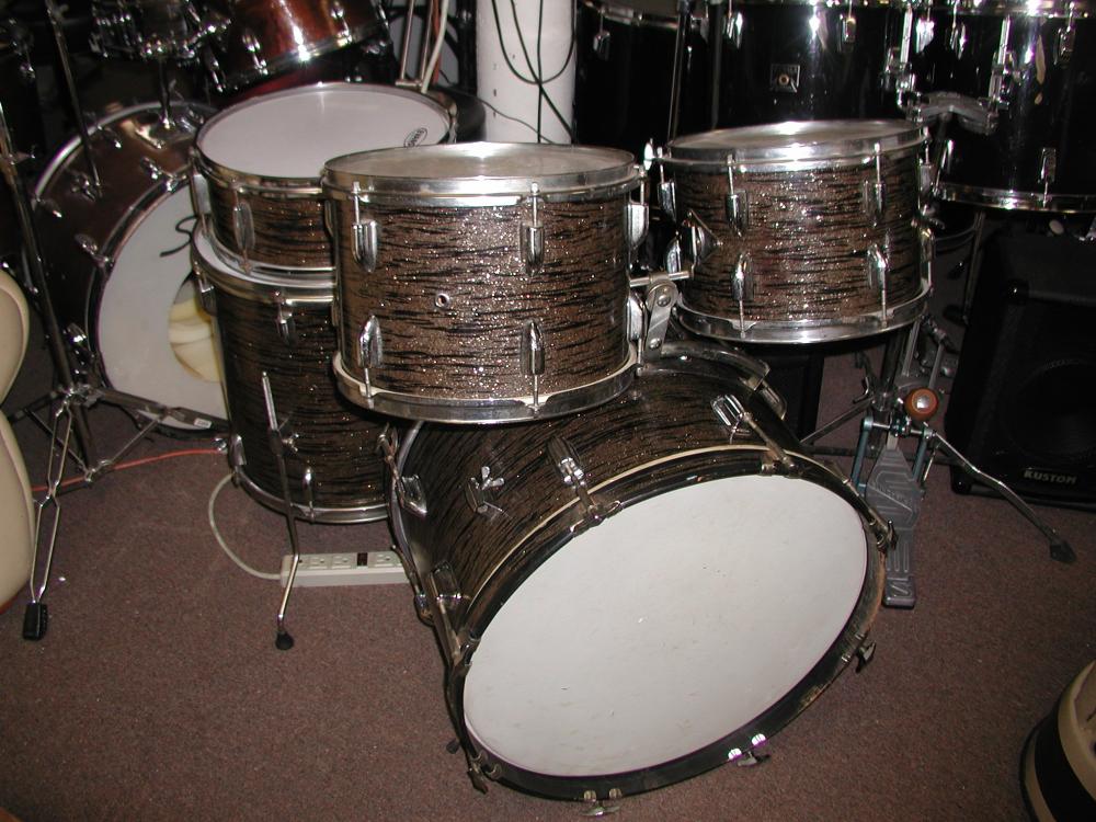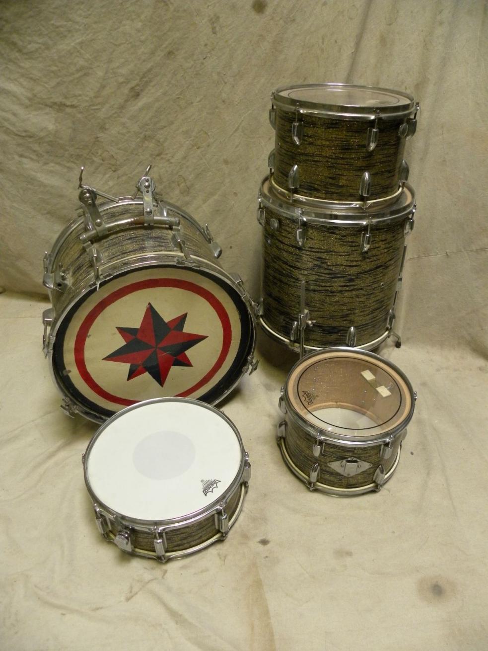 A really cool looking rare finish and the price is not too bad for a 5-piece kit. Looks like new heads and all the mufflers intact. The snare could use new wires but that and a little spit and polish and you have a great looking kit.