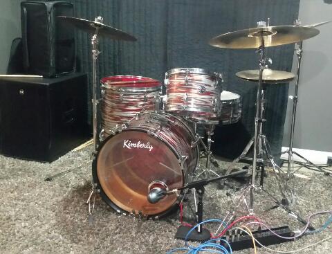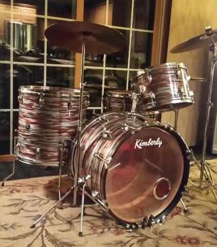 Hello folks. First time poster, long time lurker here. I thought I'd open with a few pictures of my latest restoration: a mid 60s Kimberly set I aquired. It started life as a gold sparkle kit who's wrap was in poor shape. I stripped them down, hand sanded and trued up the bearing edges, treated the shells with three coats of danish oil, let cure and then finished with Howards Feed and Wax. I rewrapped the whole set with copper strata drum wrap and new Evans heads all around. I chose a clear bass reso to show off the beautiful wood interior. The set now resides in our studio and is being put to work recording. Unbelievably warm punchy tones out of this beauty. :)