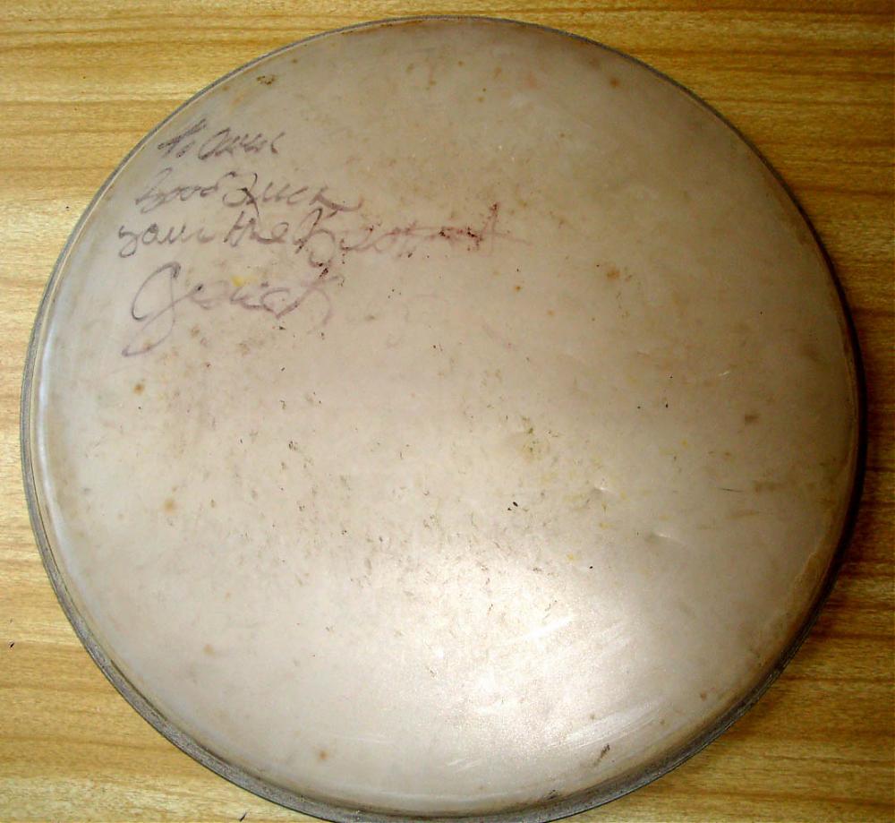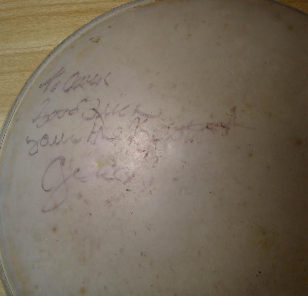 Help2I found a 10x14 Duplex "Spirit of Louis" Butterscotch Marching Snare drum at a Swapmeet around this area. The Batter head is the one pictured. There's an autograph that reads" To (Omar?) Good Luck
