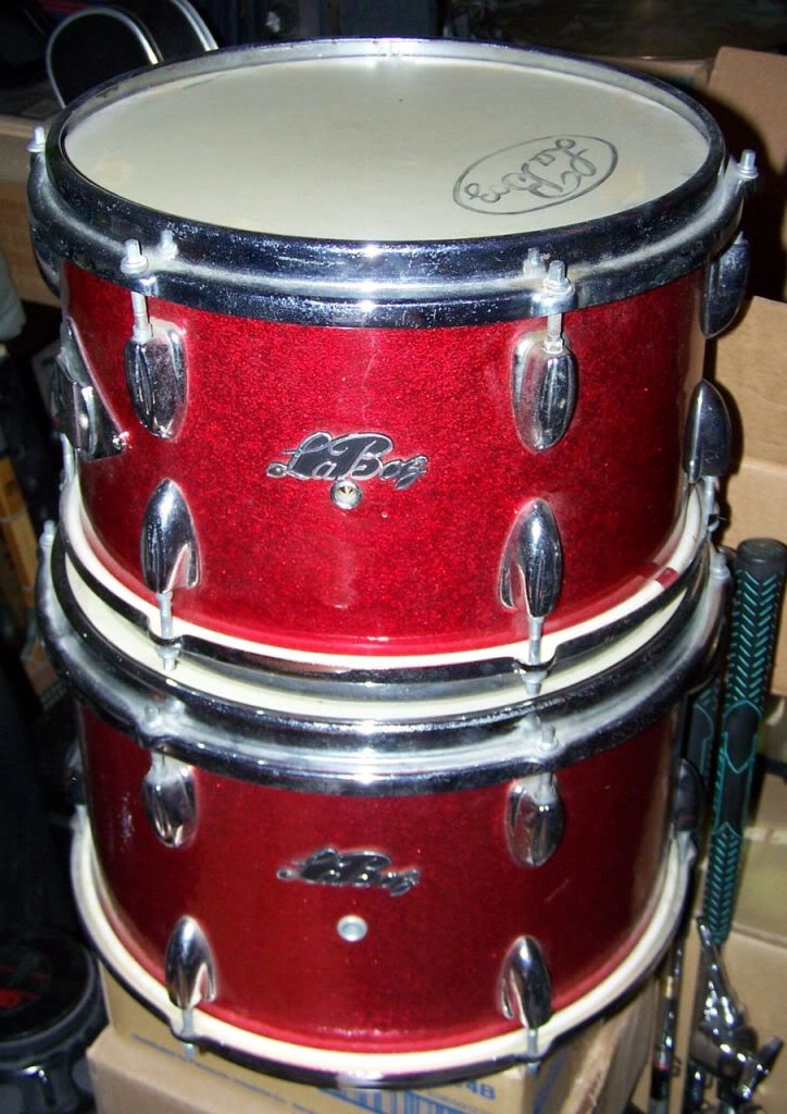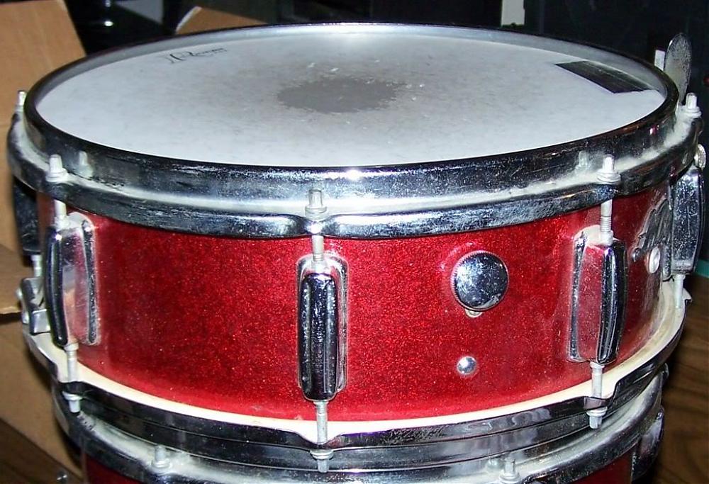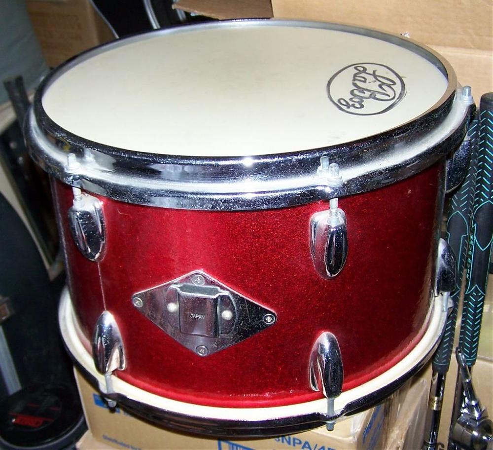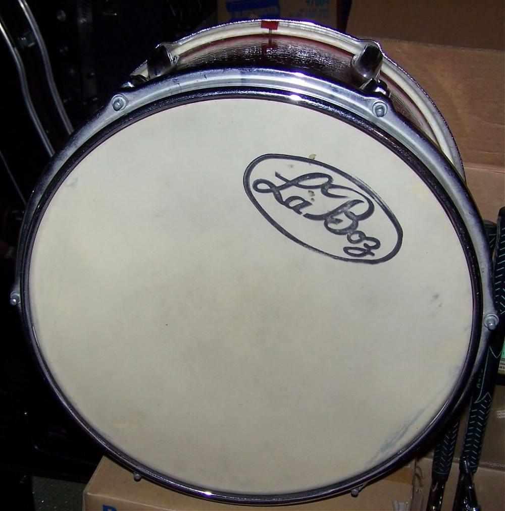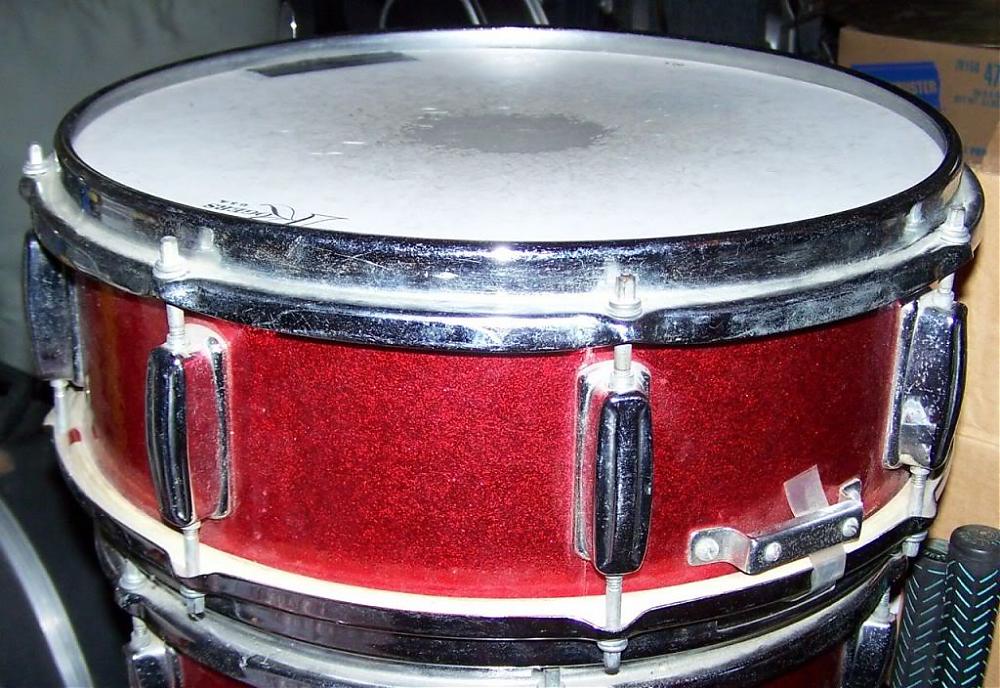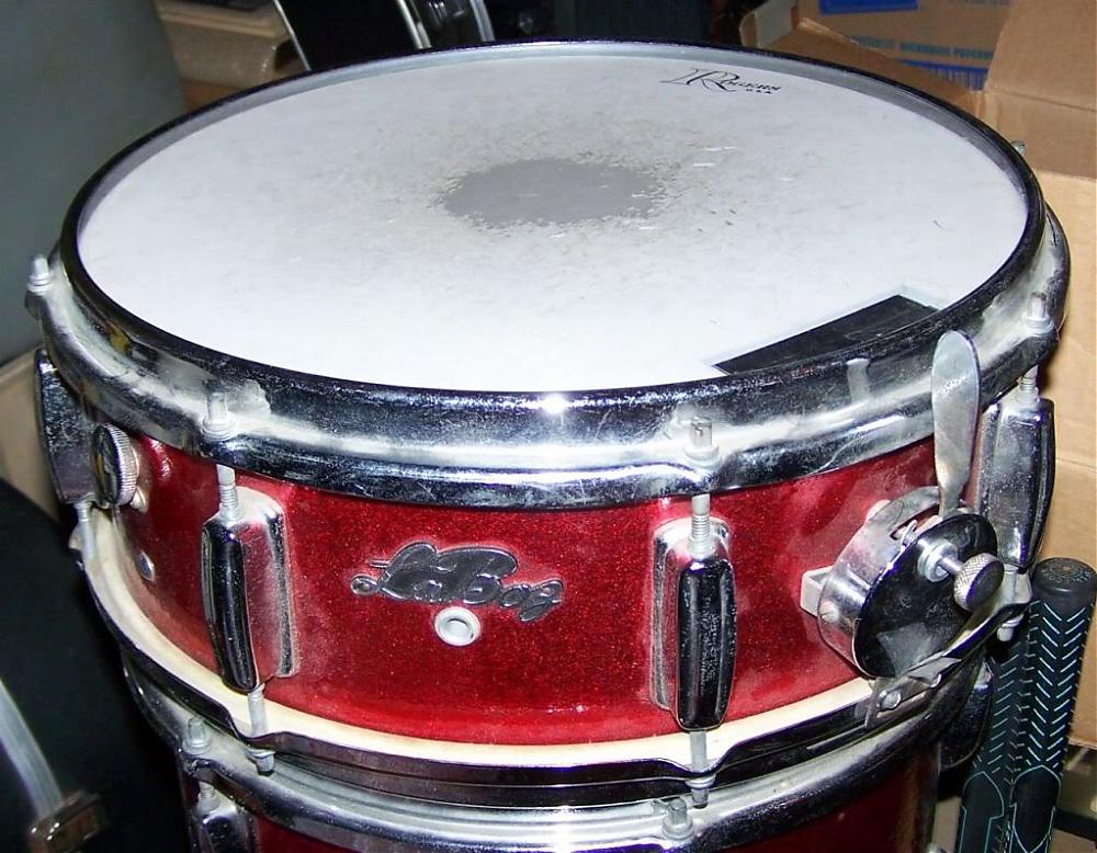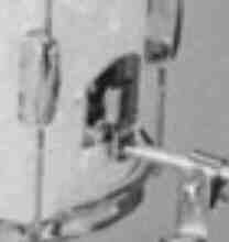I dig the baseball bat cymbal holder on the bass drum (at least I assume that's what it is). Is it a clip mount with something that slides underneath it? It almost looks like it's raised off the shell a little bit. I also like the unique strainer.