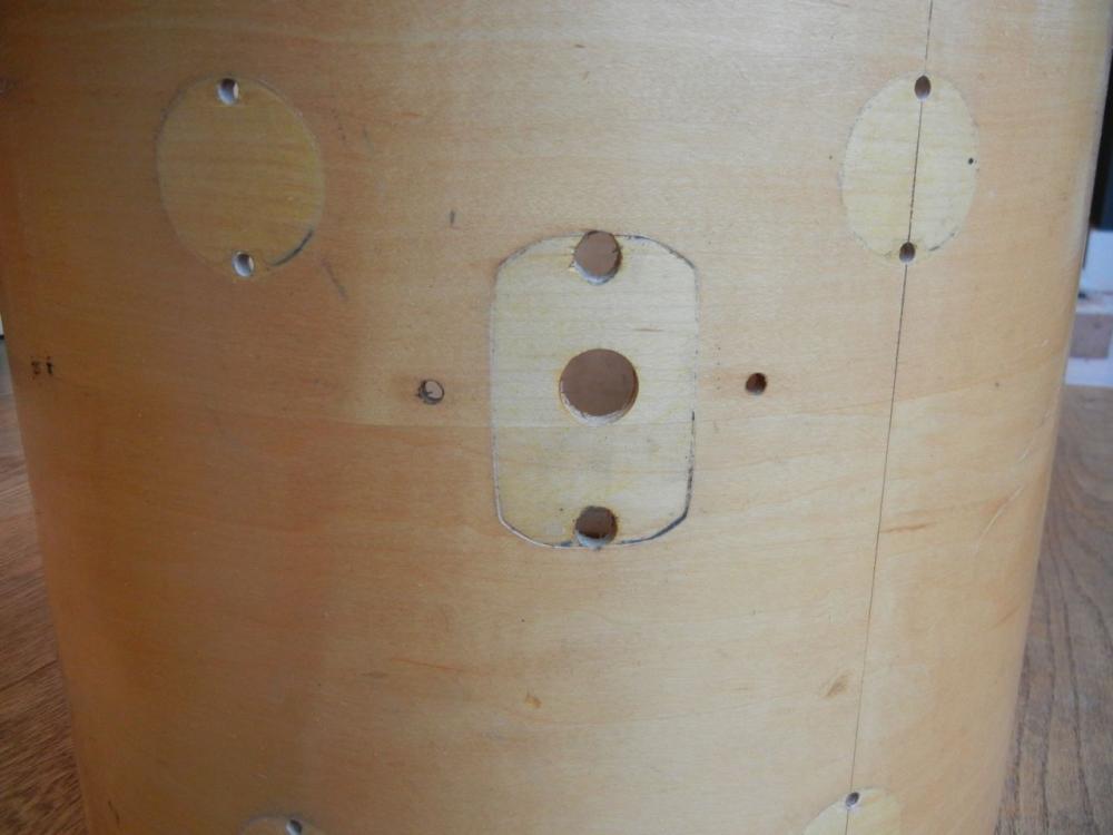 Try some Rogers Swivo hardware on the kit! The oval Swivo bases may hide (some) of the holes left by the last mount. My Oaklawn Camco orphan kit has Rogers Swivo hardware that was installed when the drums were purchased. It looks great on them and it -works-! Try it, see if it doesn't hide the repairs.