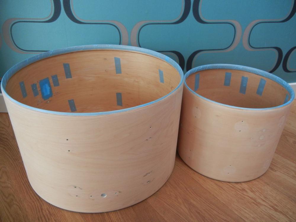 Hi Folks,Since the last posts are gone, here again a quick update on the progress of this kit.The 4 shells and the 2 BD hoops had on top of the factory finish, a thick and very poorly applied coat of what appeared to be a boat varnish. Very hard and very nasty stuff,...I removed all that with a „mild” chemical stripper. To get to the bare wood, I had to repeat this process 3 times.After that I sanded the shells with 240, 320 and 400 grid sandpaper.