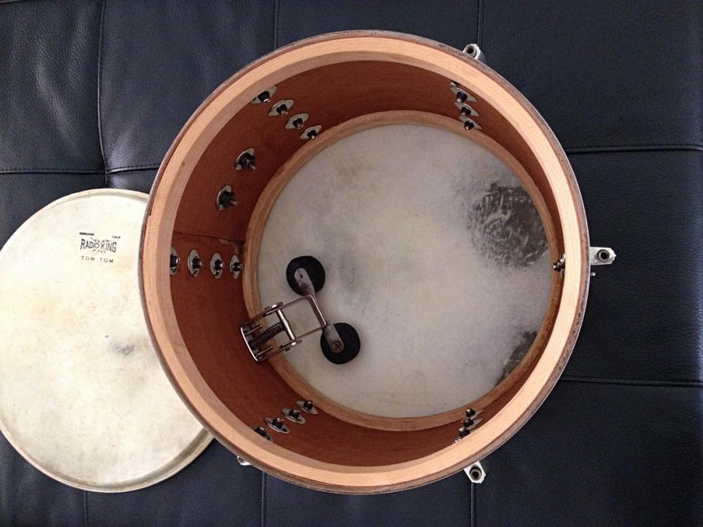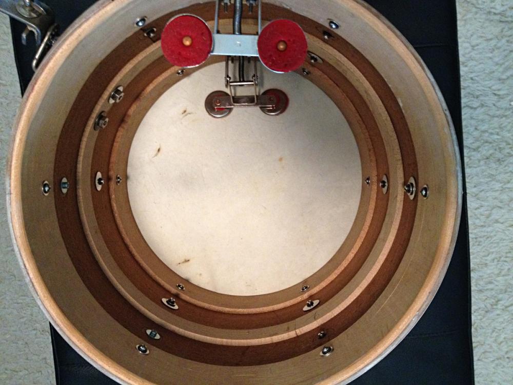 The scarf joint and the bottom rering was separating. Bob Rodriguez gently coaxed the scarf back into place and reset the rering with epoxy. The drum is solid and plays beautifully with (snug) modern heads and Puresound repro wires.
