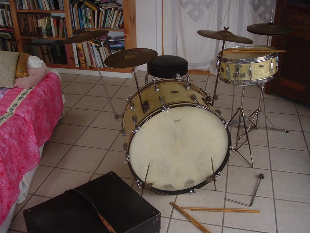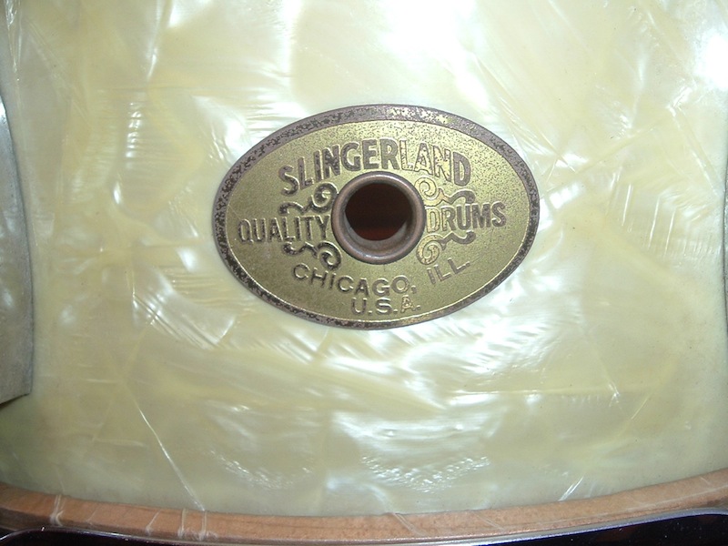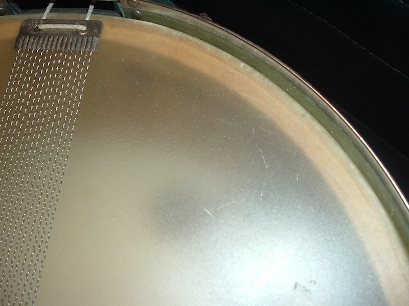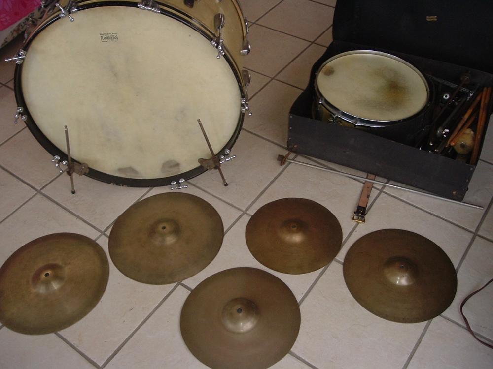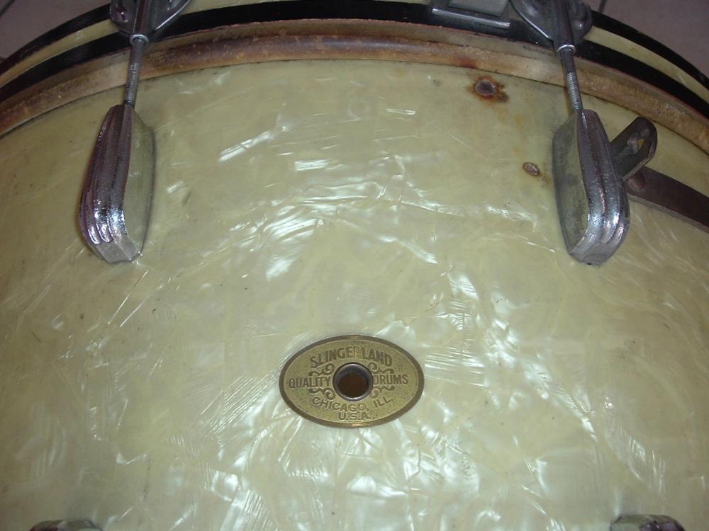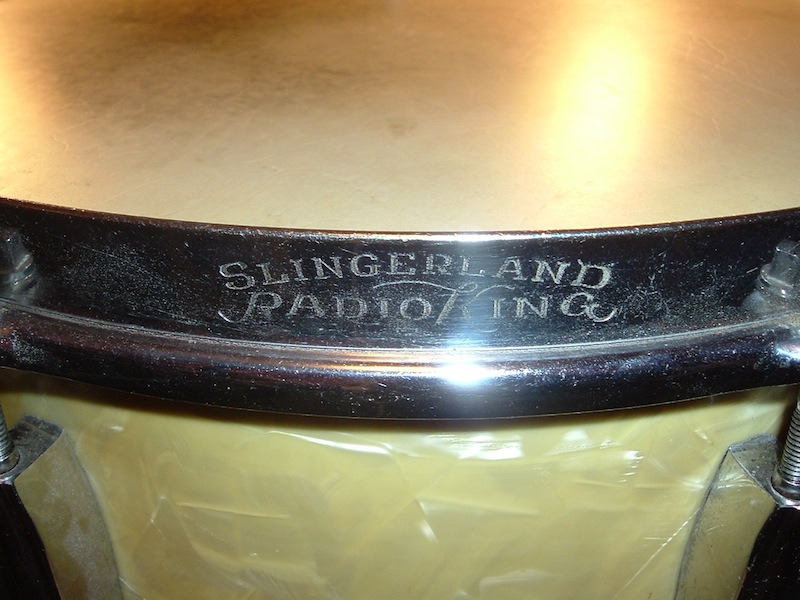 The solid rim 5 1/2 x 14 Radio King snare, the 24" bass drum. Both in White Marine Pearl...yellowed nicely. The bass drum heads are clearly marked Radio King Calf skin. The snare is well marked Radio King. These drums do not look like they were greatly abused in their lives. Just honestly put to use and enjoyed.