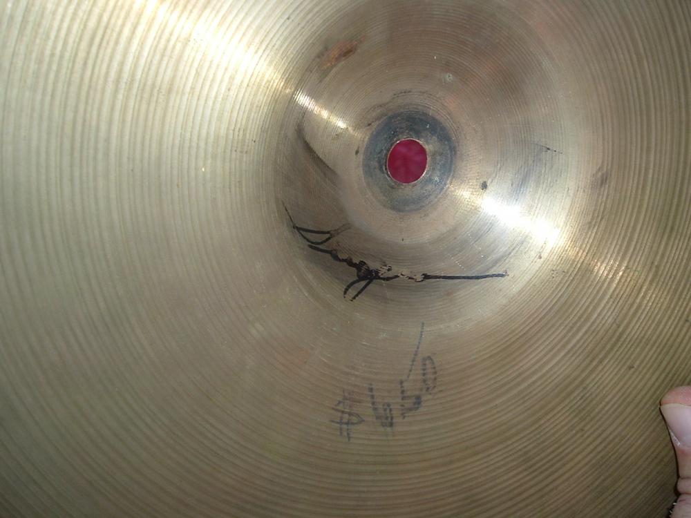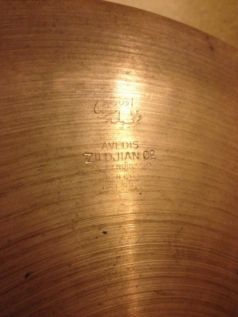 A period Trans Stamp Avedis Zildjian hi hat. The cymbals weigh 1008 and 539 grams. Additional cymbals include a Zenjian at 486 grams, one marked Germany at 940 grams and a little crash with a handwritten name on it that is 261 grams. No cracks or other damage noted. Also none of the keyholing some exhibit.