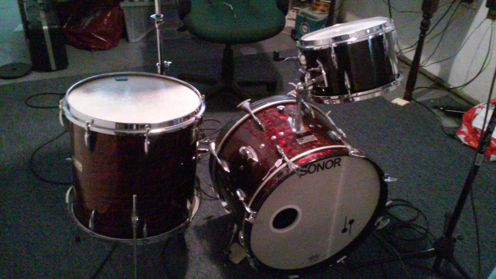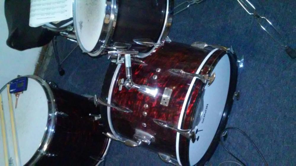 I'm selling my Sonor Teardrop set in ruby pearl wrap. These sets were 5 or 6 ply shell by this time, not the ultra thin shells. + Sonor slotted tuning key. Made in Germany badge dates them between 1969-'71. Sizes: 20x12x16
