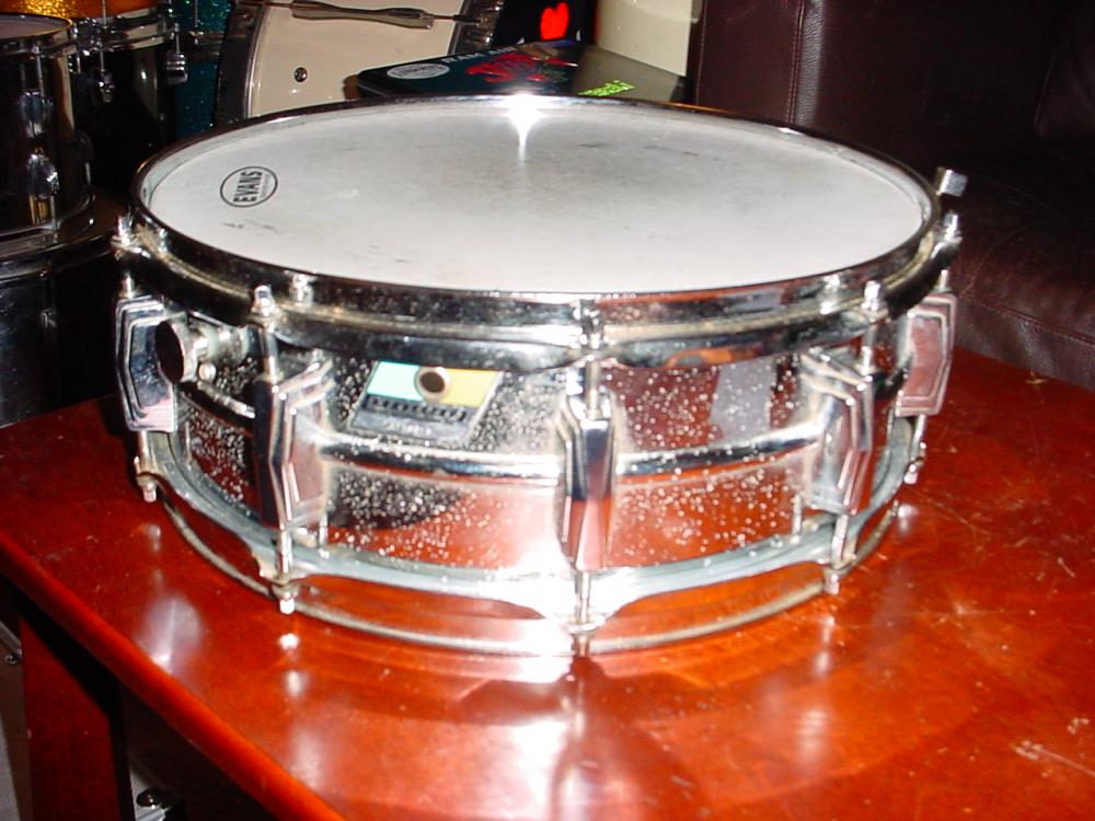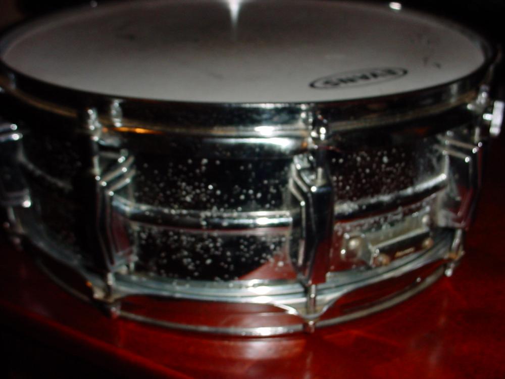 5"x14" late 70's Supra snare. Shell has a lot of pitting, sounds good though. Throw works fine, has muffler Ludwig snare wires, Coated Emperor, used but still has life left in it, Reso head is an old Ludwig, has a small slit .5" in it. Serial number is 1716018. $170.00, shipping included to the US(lower 48)
