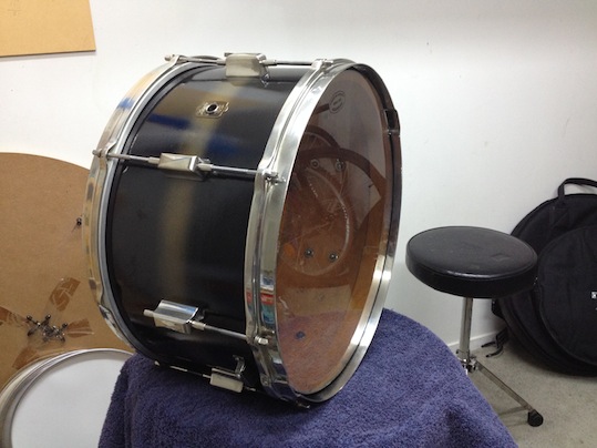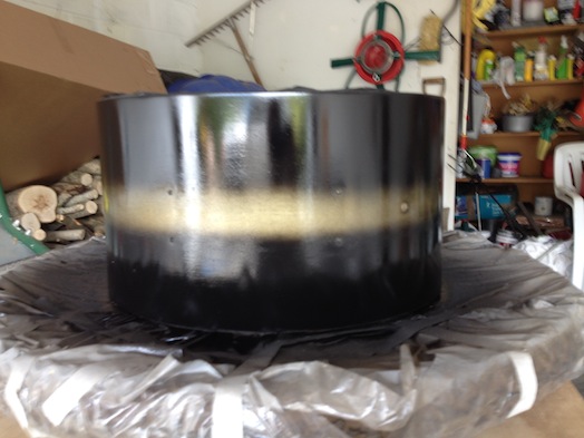 As you know, I did question whether it was philosophically acceptable to strip the original paint from the shell but the appalling condition of parts of the original Duco finally tipped the balance for me. Overall, I’m very pleased with the finished drum and can safely say that it turned out a lot better than I had expected. At one point during the re-spray, it really looked awful and I was almost resigned to the fact that I would have to strip it back to the bare shell and start again or perhaps even leave it natural. But I’m glad I persevered. The only thing that is a little disappointing is that the gold band is a lot less ‘yellow’ than the original was. Maybe they used a gold leaf type paint, which was brighter. Who knows. I also think that the original ‘black’ paint included a dark blue pigment because there were definite areas of green between the gold and black areas.
