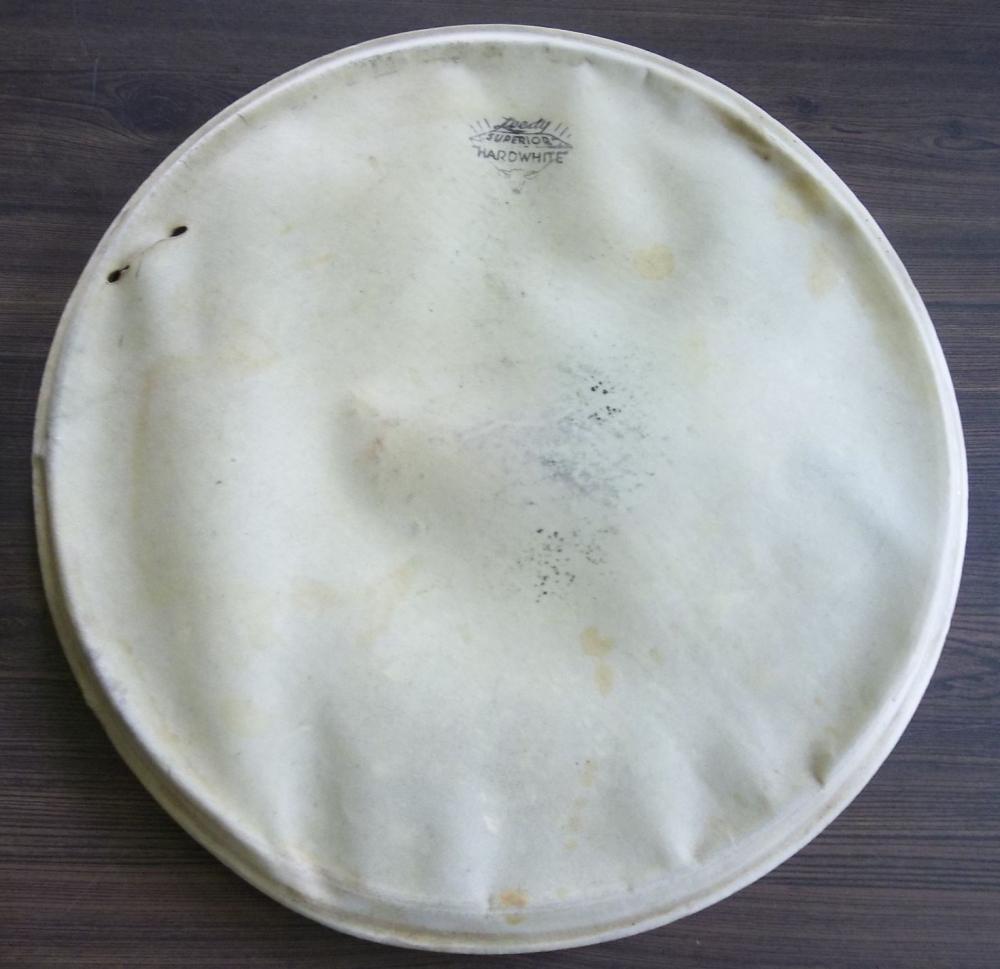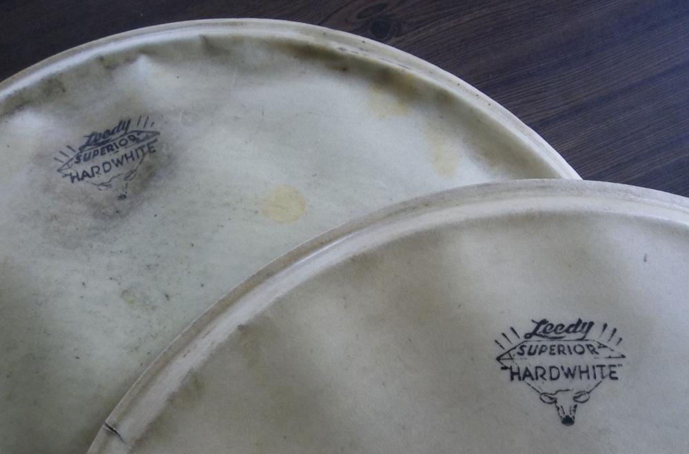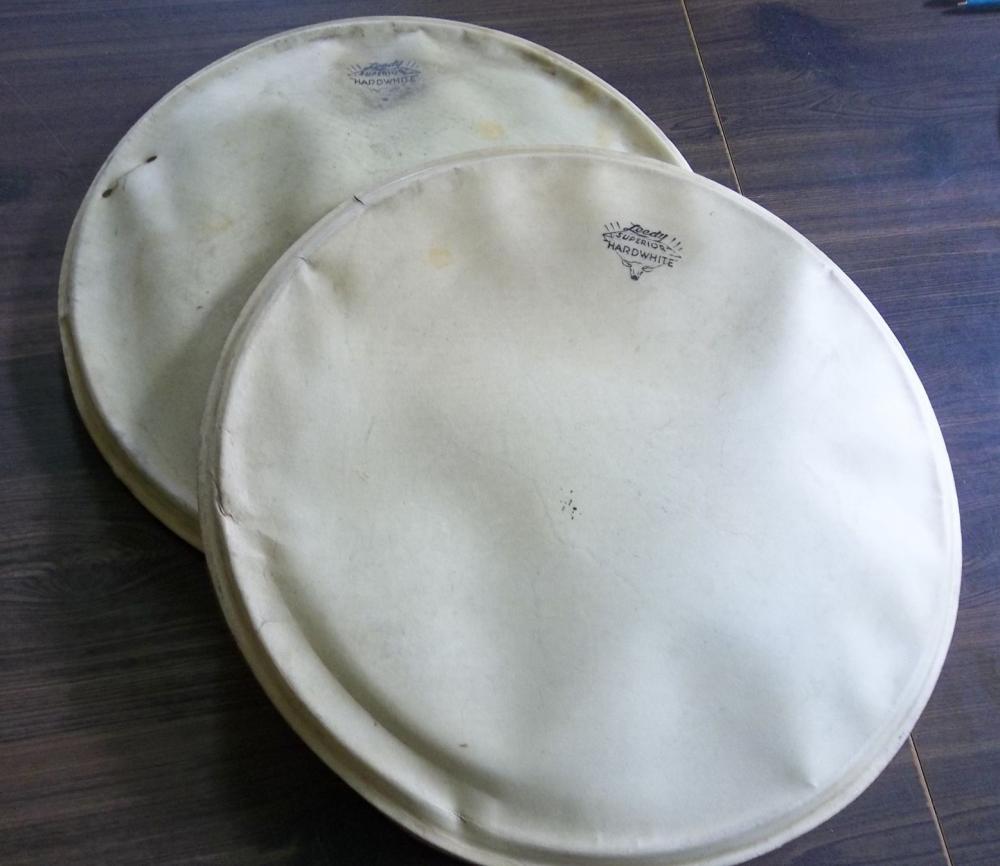 Would anyone interested in these 14" Leedy Superior HARDWHITE drum skins? One has about a one inch tear which, like a cymbal repair to halt the spread of a crack, had the ends of the tear 'drilled' out. The hoops on them are not perfectly round which I would imagine being a result from age related shrinkage. I placed them up against one of my 14" metal snare drums and they would need stretching to fit, if possible. From the backside, the wood hoop is visible on one (without the tear) where the skin has pulled away from the hoop, so I assume they are both of the same construction.