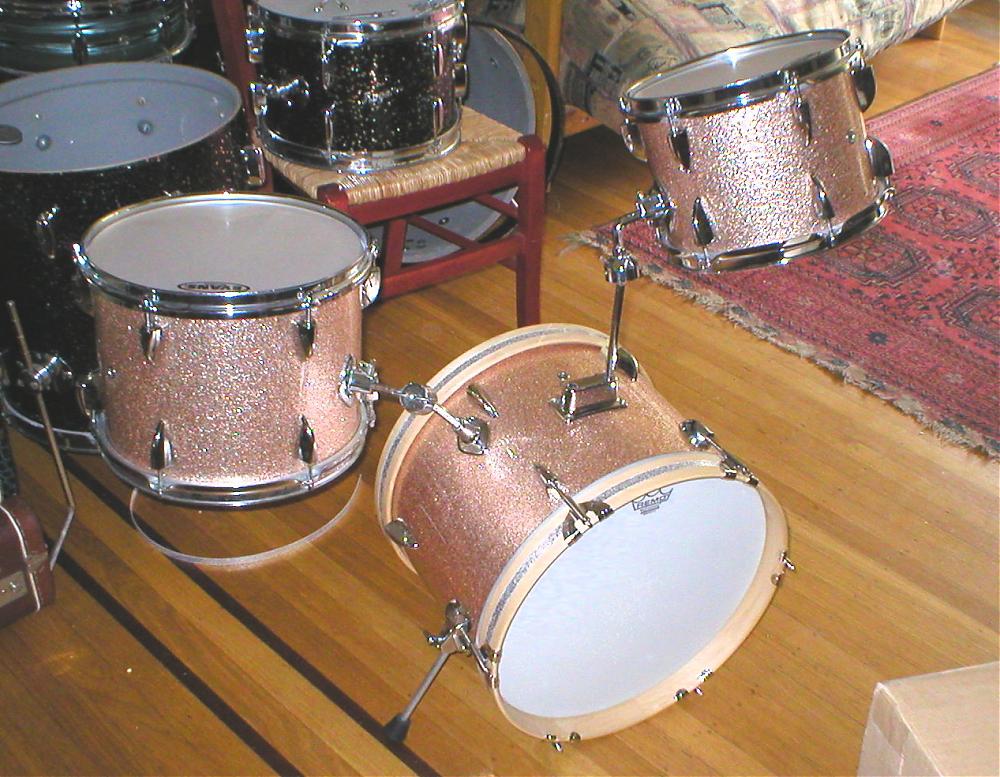 11x16 bass, 9-1/2x12 low tom, 7-1/4x10 rack tom, Keller 5-ply maple shells with 45 degree edges...just had enuff Champagne left over to cover 'em all....add a spare pair of maple 16" hoops, tung-oiled, and a slew of generic lugs I won off eFlay for nuthin' over a year ago....and some pieces of old Japanese swivomatic-style hardware....