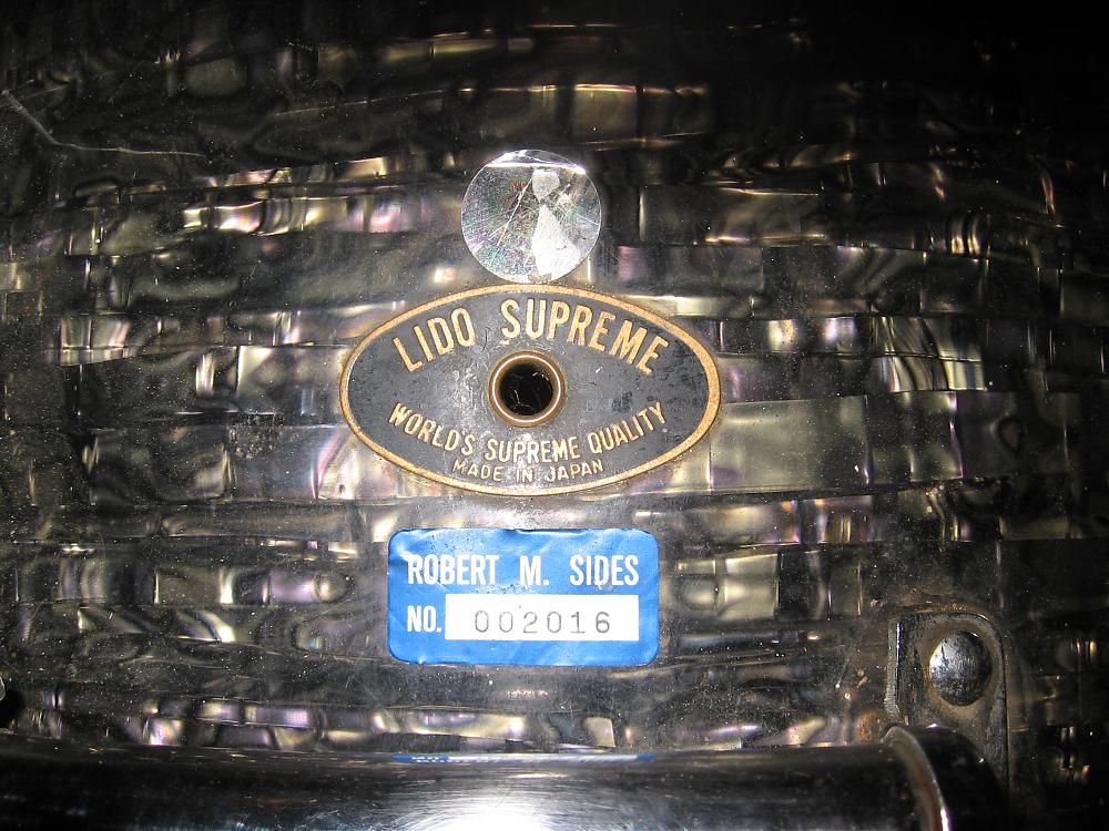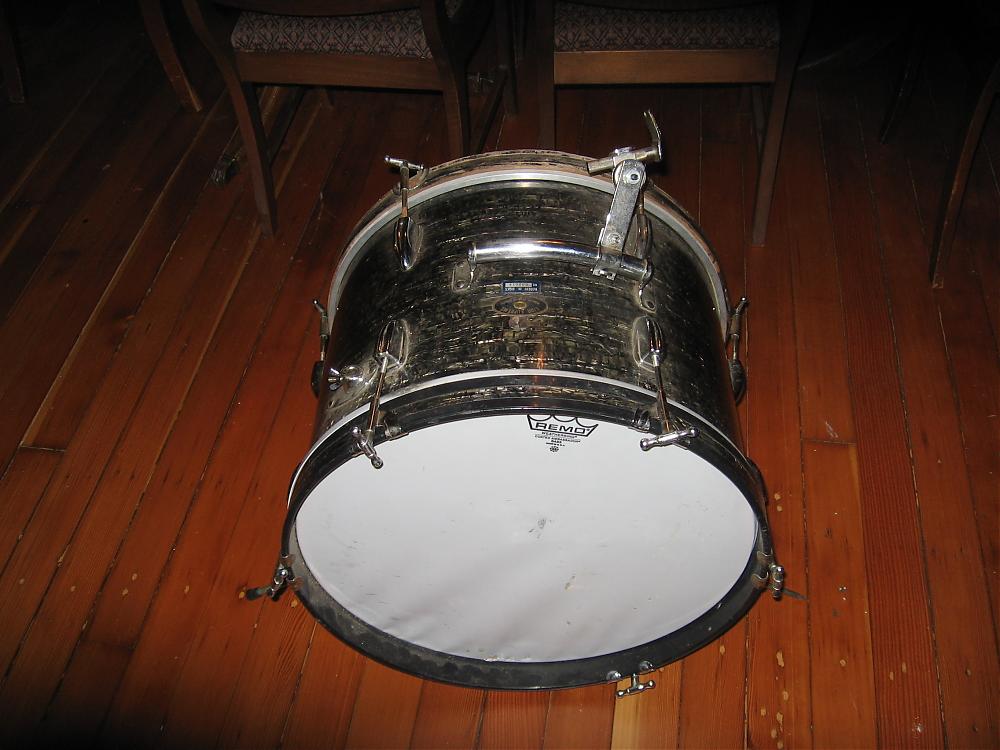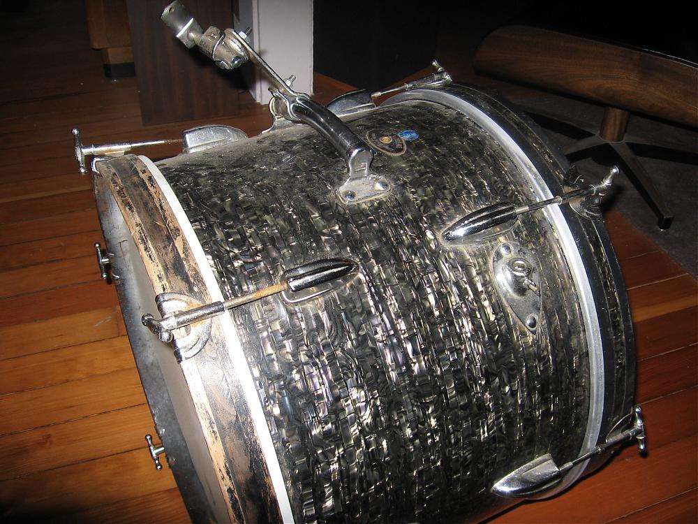 Check out the wrap on this MIJ Lido Supreme 20" bass drum. It looks like it's trying to be black oyster pearl, but seems to me made of diamond pearl strands. It's very unique, whatever it is.