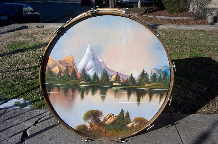 Ah, there is a painted head bass drum on ebay at the moment,It was listed under furnishing as some one added a glass top,The drum is I'm sure a Leedy single tension 28".I made equiries about shipping to the U.K. but would cost too much for me but I did suggest that the seller listed it under percusion,Its very art deco with a dancing young lady,My mother would have said that "she looks no better that she should be"??? ebay no. 280400436149. Dion...