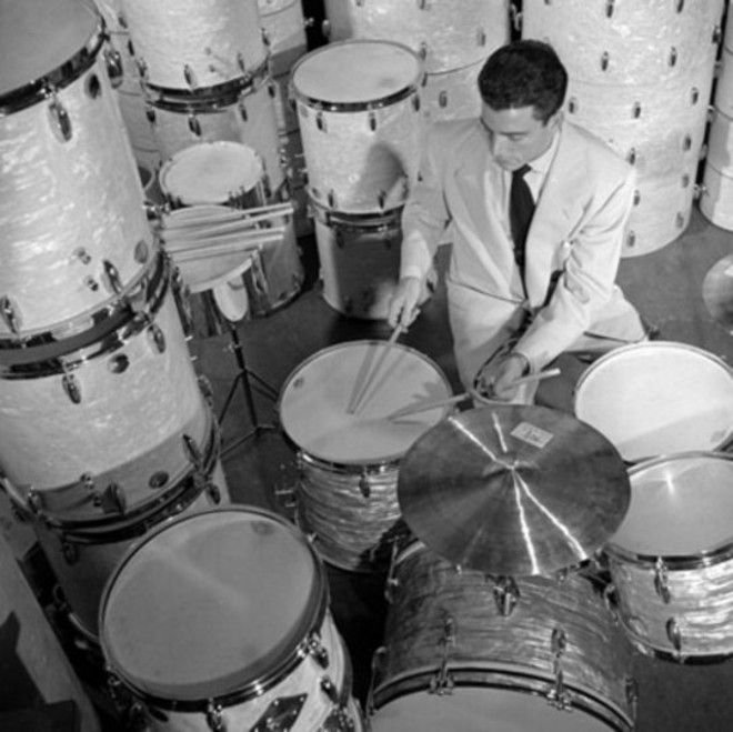 Full page B & W photo of Louie, ( Mid 50s era, ) wearing a Light colored suit with a dark tie, using gretsch drums. Playing on floor tom of a small 4 pc kit, with extra drum shells stacked around & behind him. Can anyone help ?