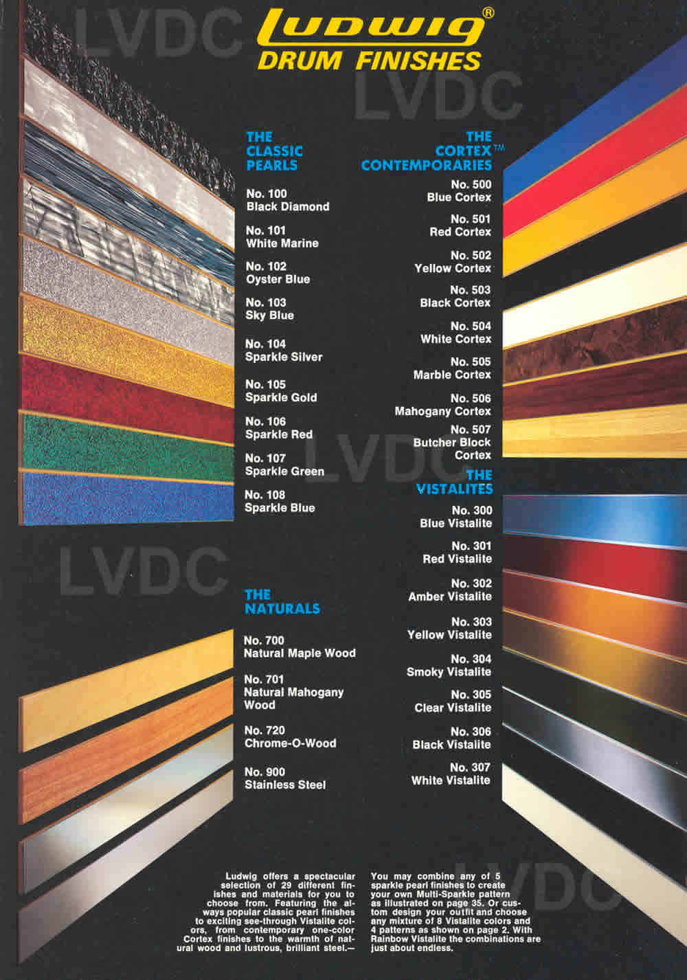 Does anyone know where I can find examples on-line of the pearl finishes Ludwig had availble in 1979? A scan of a catalog page would be great. I checked the Vintage Drum Guide and they didn't have a 1979. Thanks! SC