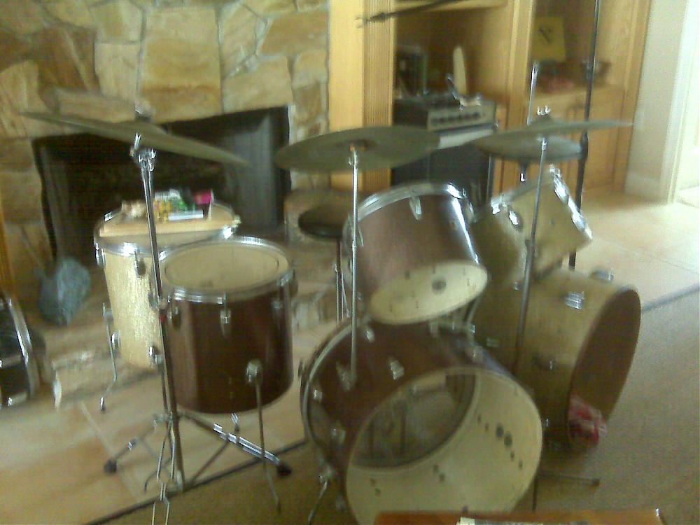 Your kit ($400 WOW) is a combo of the classic and downbeat kits. The 9"x13" tom & 16"x16" floor tom are from the classic kit. The 14"x20" bass drum is from the downbeat kit and is rare. The burgundy rap is rare also.