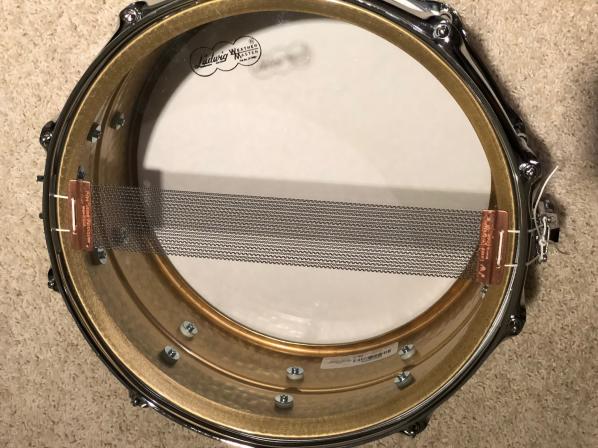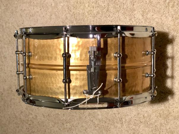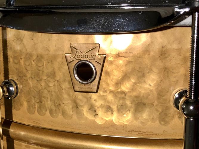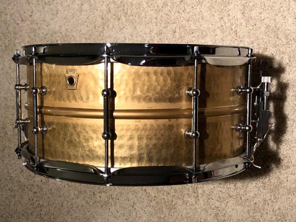 Ludwig 6.5x14 hammered brass snare for sale. I am told this was from NAMM and may be a one of a kind prototype. The shell is raw unpolished brass and appears to be unlacquered, so it will patina nicely! Very unique. As you know, all the production model hammered shells are highly polished.
