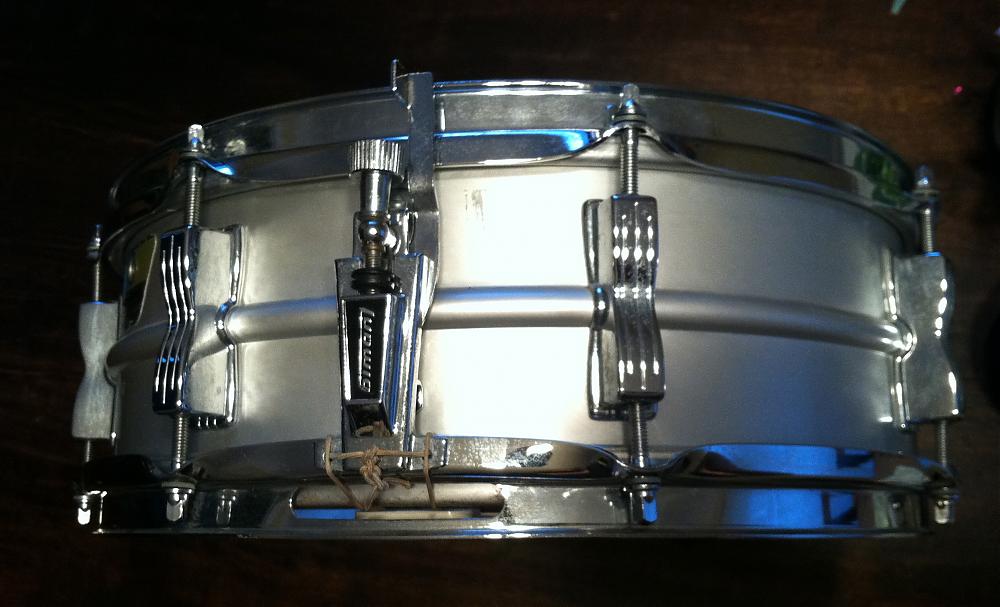 A few scuffs on the shell, hoops and lugs have a few scratches. Comes with original snare wires, which are in fair shape.