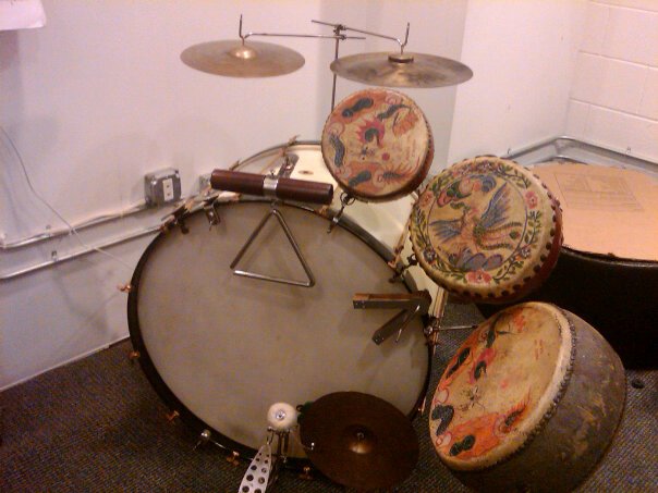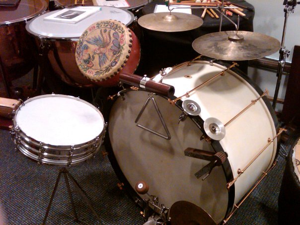 Ludwig trap kit from early-twenties (hence the thumbscrew knobs)...amazingly preserved DeLuxe finished hardware.