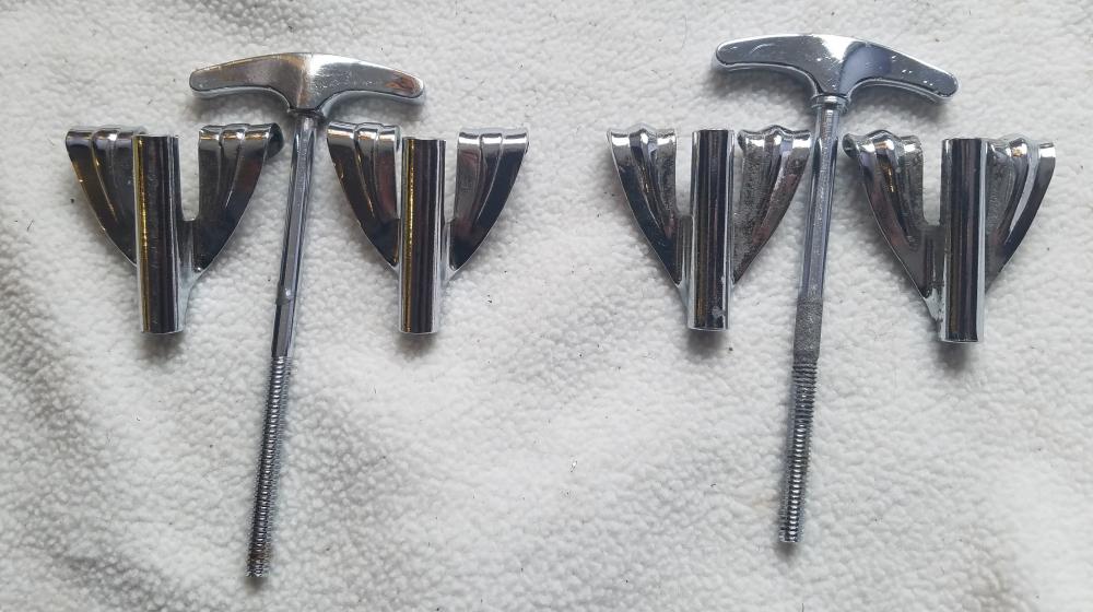 They're on the left. Right is your run of the mill Ludwig claw and t-rod I pulled off a Vistalite. As you can see, the shape is wrong on the claws and the t-rod doesn't have that small disc around where the shaft meets the handle. In addition the handle is about 2 mm thinner than the Ludwig one.