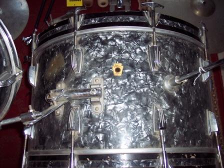 Here are are some pics of the preserial KB Ludwig BDP drum kit I found at a local antique mall for which I paid $270. I put the kit in lay away and have now got it home and I am now ready to post some photos. I have located a later 1966 BDP floor tom that I will use untill I find a preserial KB one. I got all that you see in the photos plus some including a nice highhat stand and some other stuff and it is really not in bad shape...needs cleaned up and polished mostly. The preserial KB snare is nice and is really heavy and has no pits on the shell and I believe it to be COB. Most of the hardware has minimal pitting and not a lot of rust and all the wrap seams are nice and tight. The kicker hoops need repainted and the kit really needs a good cleaning and polishing. I am getting ready to remove all the heads and hardware to do the resoration project. Keep eyes out for me please for the BDP preserial KB 16 floor tom! I just pulled the kicker heads and it is stamped Sept 27, 1961. I think I got the set for a good price. I welcome any comments and suggestions as well.