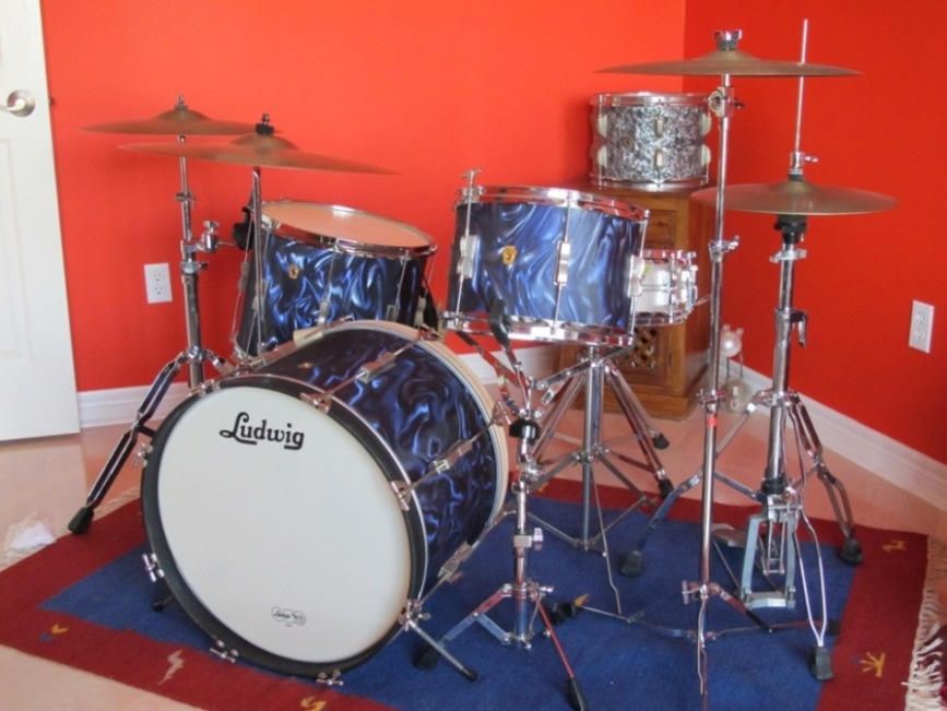 I picked up a 6 piece Ludwig Classic kit today that has been badly abused. It's 14x24, 8x12, 9x13, 10x14, 16x16, 16x18 - all 3 ply except for the bass drum, which is 6 ply. Somebody stripped the wrap from this kit, painted it black (insides and hoops too), and did not replace the badges. The bass drum is the only one with a badge. I will be restoring this kit and need an opinion on the wrap material that I should use. I'm not interested in spending $400+ on regular wrap, so I've come up with two options.