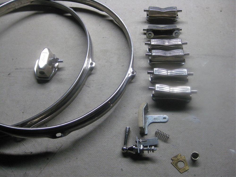 Time to move out some parts I'm just not going to use any more. The shells have been recycled into a different project and up for sale I have a pair of 13 inch six hole nickel hoops, six nickel bow tie lugs with screws, a nickel tom mount sans screws and washers, a complete baseball bat muffler with white felt, and a keystone badge #270164 with original grommet that will need to be replaced most likely, but would still pass in a pinch. The supposed bottom hoop has some minor rust and pitting in the crease of the flange, but passes as vintage patina (read old) the top hoop is in cleaner condition. Price for all is $45.00 plus actual shipping to lower forty eight states only. US Postal money order only please.