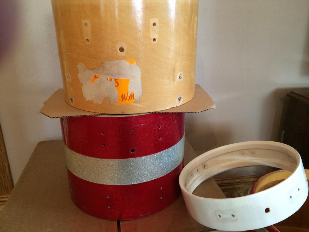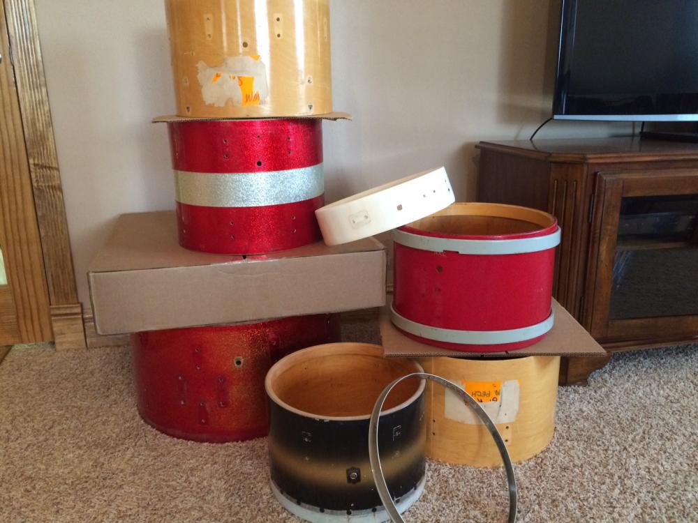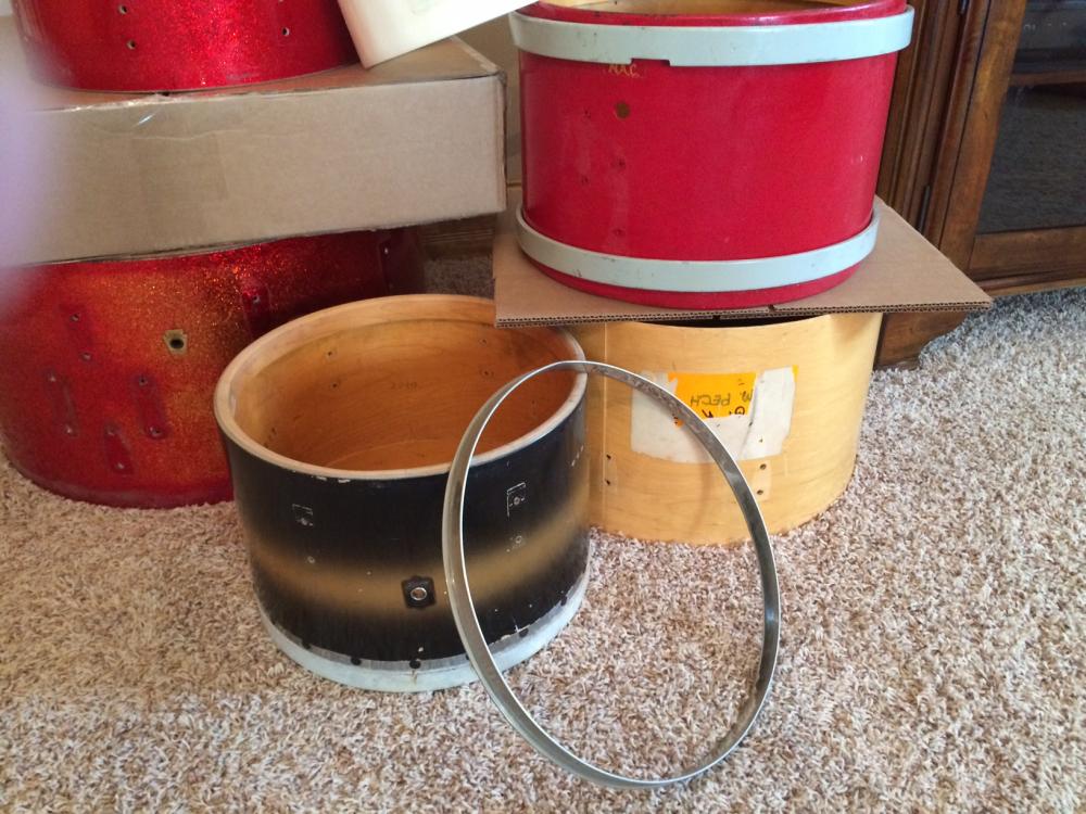 Maple 16x10, and 15x10 concert shells. 15x10 dated Feb. 24, 1969. Both were drilled for straight clubbie mounts, and one hole through re rings. $35 each