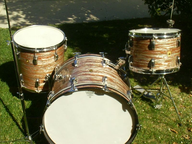 "original 60s wrap! Pink Oyster! Finish! extremely rare! bass drum is a WFL with red date stamp inside of nov 1950, and the other two are 60s"